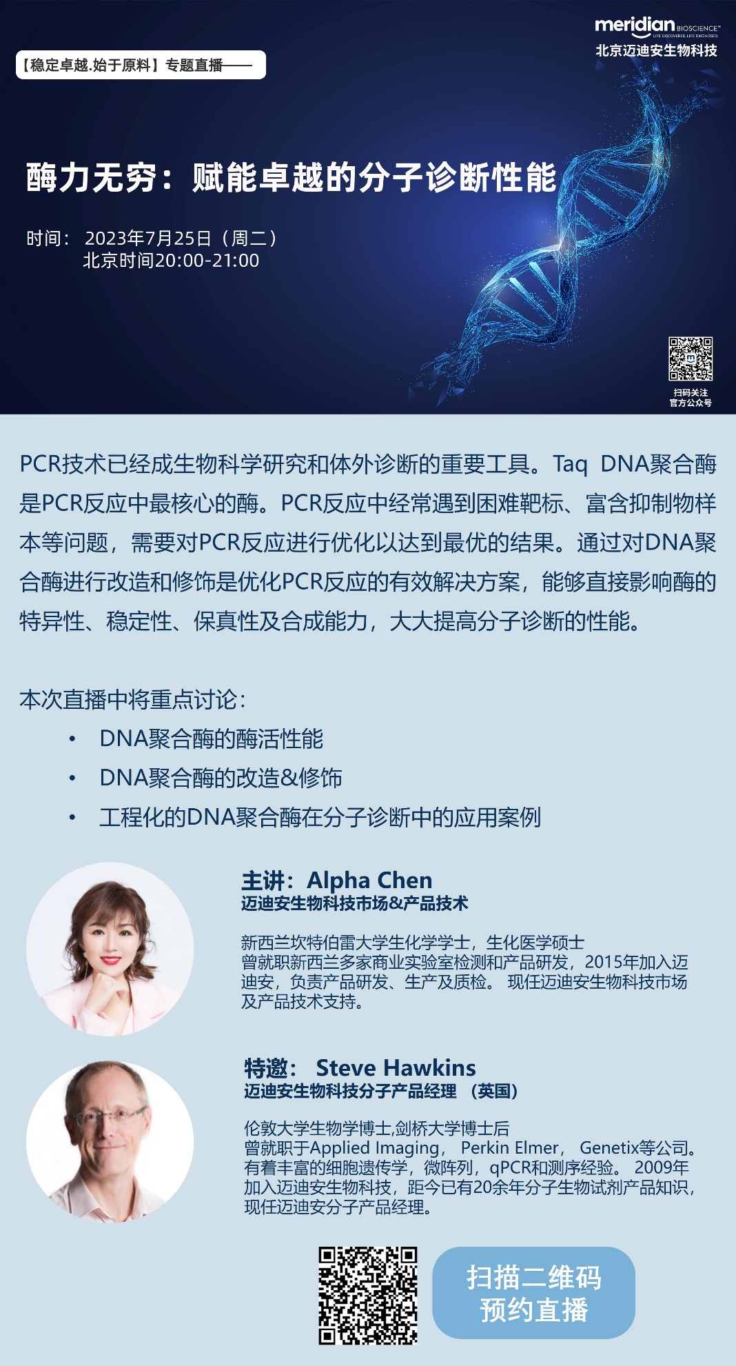 PCR技术改变了现代分子生物学,而Taq DNA聚合酶改变了PCR。 Taq DNA聚合酶是PCR反应中最核心的酶, 最初用于PCR的DNA聚合酶是20世纪70年代初期由Klenow发现的来源于大肠杆菌 DNA聚合酶I上的 Klenow片段来生成新的子链,但是这种大肠杆菌酶对热敏感,易受到变性阶段高温的破坏,从而无法继续进行退火和延伸步骤。因此,需要在扩增全程每个循环的退火步骤中重新补充添加酶,故而该酶不能广为应用。 1976年,一种更稳定的Taq DNA聚合酶从一种叫做水生栖热菌(Thermus aquaticus)的嗜热细菌中分离出来,这种细菌是从美国黄石国家森林公园的火山温泉中分离得到的,生长在70-75℃极富矿物质的高温环境中 。因此它比大肠杆菌 DNA聚合酶具有极高的热稳定性。 热稳定的DNA聚合酶目前在分子生物学、基因工程和分子诊断中应用最广泛,但具体的实用性取决于各种性能特征,如纠错率(保真度)、延伸率(合成能力)等。 不同特性的DNA聚合酶可以解决DNA合成过程中遇到的问题 (图1),例如来自环境、临床(例如血液样本)、古代和法医样本的DNA扩增,这些困难样本中富含抑制物易导至扩增效率降低。扩增某些长片段或高GC含量的DNA或环状序列也可能出现类似问题。 图1. PCR扩增中跟样本有关的常见问题 尽管热稳定的Taq聚合酶大大提高了PCR反应的应用性,但其本身依然存在缺点。例如由于其缺乏 3' → 5' 核酸外切酶活性,因此降低了其在PCR扩增中的忠实性,限制了其在基因克隆和基因测序的应用。此外,该酶在室温下依然具有活性,易导至引物二聚体的产生而降低反应的特异性。 针对这些缺点,一系列的改进优化,比如反应缓冲液的优化、加入热启动技术、使用基因工程技术改造Taq DNA聚合酶等等,以加强酶的稳定性、特异性、扩增能力等。 随着分子诊断技术不断革新,对PCR反应的速度、灵敏度、特异性和多重扩增能力也有了更高的要求,而优质的DNA Taq聚合酶则是满足这些要求的重要奠基石。 Meridian迈迪安生物科技在Taq聚合酶研发和生产方面具有30年的丰富经验,一直为全球分子科研和各行业诊断研发企业提供最优质的分子核心酶。 2023年7月25日晚8点,迈迪安将举行主题为《“酶”力无穷:赋能卓越的分子诊断性能》的线上直播,并特邀了迈迪安英国研发总部的元老级产品经理Steve Hawkins做客,欢迎各位同仁观看交流,扫描下图中二维码即可预约: |