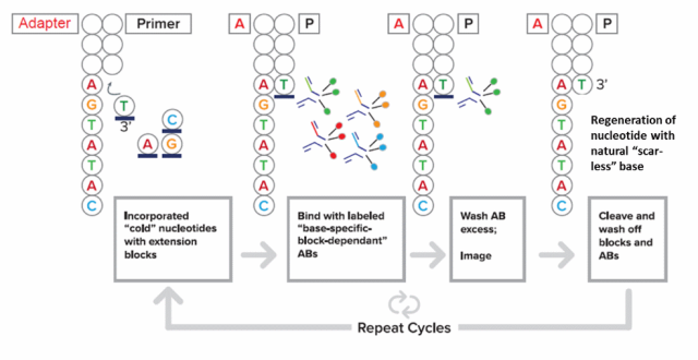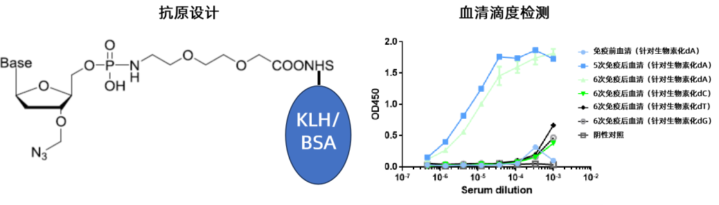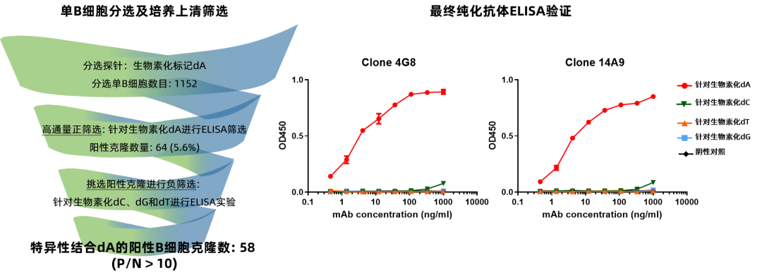 高通量测序技术(High-throughputsequencing)又称“下一代”测序技术("Next-generation"sequencingtechnology),以能一次并行对几十万到几百万条DNA分子进行序列测定和一般读长较短等为标志。其中,基于大规模并行测序(massivelyparallelsequencing,简写MPS)的DNA测序技术能够在DNA纳米阵列上以相对较低的成本提供数十亿次读取,并能实现多种基因组应用。同时,通过进一步提高MPS测序的读取长度、序列质量和降低成本将使更经济实惠和准确的全面健康监测测试成为可能。 目前,MPS测序主要使用染料标记的可逆终止核苷酸(dye-labeledreversibly terminatednucleotides,RTs),但是这些核苷酸(RTs)存在着以下一些缺点:合成成本高、结合效率低、每个碱基仅限定一种染料使产生的信号有限、以及会造成天然核苷酸的不完全再生(即在染料剪切后,染料连接物的一部分作为“疤痕”残留在碱基上)。因此,华大基因(BGI)及其在美国硅谷的子公司CompleteGenomicsIncorporated(CGI)开发了一种新颖的、更高效和准确的MPS测序方法,称为:COOLMPS™(图一)[1]。 图一 COOLMPS™测序的概念于2016年由CGI提出,并申请了专利。其基本原理是在测序过程的每一个循环中,利用特异性识别单个核苷酸的荧光标记抗体和3’端的天然核苷酸结合,阻断DNA链的延伸并通过读取不同的荧光信号,辨别不同的3’末端碱基类型;然后通过条件的改变,使结合在3’末端核苷酸上的荧光标记抗体解离下来,让天然核苷酸获得再生,并在碱基上不留有“疤痕“,从而在新的测序循环中可以得到进一步延伸,而不受前一个循环的干扰(如图二)。这种方法的优点在于:未标记的天然核苷酸更容易制备,成本更加低廉,并且因为在延伸过程中不产生“化学疤痕”,使其能够更高效的和下一个核苷酸碱基整合;此外,因为针对单个核苷酸的特异性抗体上,可以标记多个染料分子(如2-5个),和荧光标记的核苷酸相比,能够大大增强测序信号。 图二 由此可见,为了使COOLMPS™平台能够商业化并被广泛应用,针对单个核苷酸的、高特异性的单克隆抗体是关键。CGI自2017年开始即和优睿赛思(Yurogen Biosystems)合作,致力于开发针对单个核苷酸的兔单克隆抗体;到2021年底为止,已经成功的为CGI前后开发了三代针对于单个核苷酸的高特异性兔单克隆抗体,最终定株的抗体通过大规模重组表达生产,成功应用于CGI和华大基因推出的新一代基于COOLMPS™的NGS测序试剂盒[2,3]。 下面以dATP为例来分享对于单核苷酸单克隆抗体的开发经验。毫无疑问,针对单核苷酸类半抗原(Hapten),需要将其偶联到KLH、BSA等carrier蛋白上进行免疫(图三);其免疫周期相对于一般的蛋白免疫也要长。相对于小鼠等啮齿类动物,兔子独特的免疫系统对半抗原有更好的免疫应答,经过9周左右的免疫周期,便获得针对dATP较理想的滴度(图三)。为了更加准确的评价血清有效抗体的滴度,优睿赛思合成了用生物素(biotin)长臂(PEG)偶联的dATP,结合亲和素(streptavidin)预处理的96孔板来进行滴度检测,结果显示:在多抗血清阶段,经KLH-dATP免疫的兔血清,对于dCTP、dGTP、dTTP仍旧存在着一定的交叉反应。 图三 基于此,为了获得高亲和力以及高特异性的dATP兔单克隆抗体,首先,优睿团队对兔子进行一次KLH-dATP加免,收集脾脏细胞进行单B细胞分选后同时利用生物素标记的dATP对兔子脾脏细胞进行抗原特异性B细胞富集并加入了大量无生物素标记的dCTP、dTTP、dGTP进行封闭;然后,对分选的抗原特异性B细胞进行体外培养,一周后取上清针对生物素偶联的dATP进行高通量的ELISA筛选,同时针对生物素偶联的dCTP、dTTP和dGTP进行负筛选。经过这个流程,在免疫完成后两周之内即获得了58株特异性结合dATP的阳性克隆(图四)。 最后,CGI根据这些阳性克隆针对dATP的ELISA读数,以及dCTP、dTTP和dGTP的交叉反应率,从中选取了8株阳性克隆进行基因克隆并重组表达,四周之后即获得了超过1mg的重组兔抗dATP单克隆抗体;经优睿生物通过ELISA初步验证之后,特异性与B细胞上清阶段的筛选基本一致。CGI将交付的重组单克隆抗体荧光标记之后,在COOLMPS™上进行最终的质检测试,并选取表现最佳的2株重组兔单克隆抗体(图四),作为新型NGS测试试剂盒的重要组成成分。 图四 综上所述,利用兔子作为宿主动物,结合优睿赛思的SMab®单细胞筛选平台,在开发针对小分子抗原的高特异性兔单克隆抗体上,具有巨大的优势: 1.经研究表明,动物的免疫系统对小分子半抗原(包括多糖类、化合物、核苷酸和翻译后修饰等),并不是通过经典的MHCI和MHCII途径进行抗原呈递,而是通过CD1分子;兔子拥有四种CD1亚家族蛋白,而啮齿类动物(如小鼠)一般只具备两种(图五)[4],从而使兔子对于小分子抗原的呈递效率大大提高,增强对其的免疫反应。 图五 2.SMab®平台主要通过抗原特异性富集来筛选B淋巴细胞,使得筛选后细胞的阳性率大大提高;同时,还可以通过在富集阶段,进行负筛选、阻断等方法来去除非特异性结合的B淋巴细胞,来提高获得特异性B细胞克隆的几率。 3.SMab®平台的核心是对单个B淋巴细胞进行体外培养,上清中表达高达10 ug/mL的兔IgG保证各种筛选正常进行,包括基于ELISA方法的负筛选、竞争ELISA、阻断ELISA等,以及流式细胞分析、Western Blot分析等;通过这些分析,可以在非常早期就可以锁定特异性阳性克隆,大大减少后期克隆、表达和验证的工作量。如果通过常规的单B细胞筛选和克隆的方法,需要将多达几百个从单B细胞中