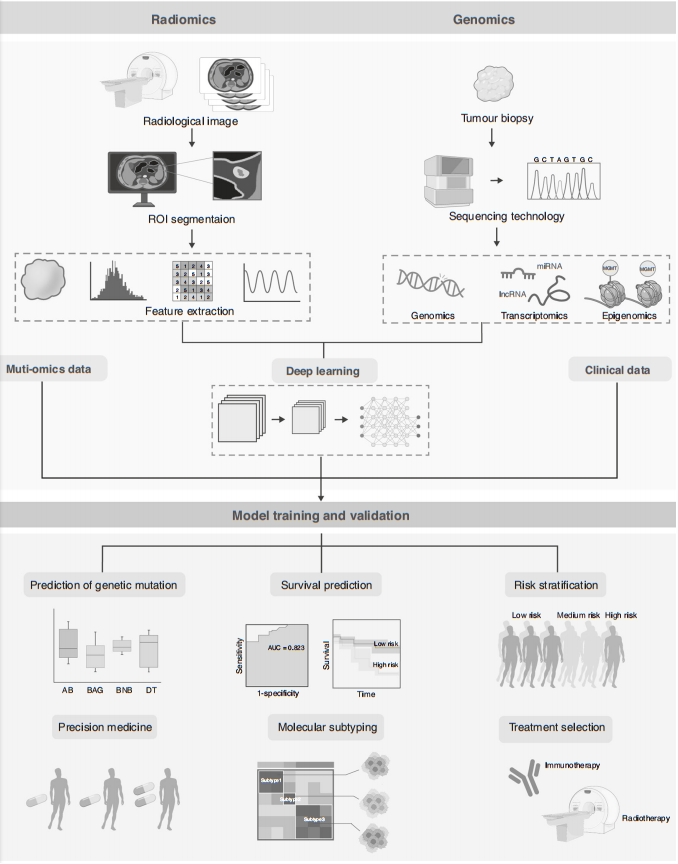 影像组学是一个快速发展的领域,它允许将放射摄影图像进行数字解码,获得定量信息,如强度、纹理、形状和尺寸指标,然后对这些数据进行过滤、聚类和分析,以识别和预测肿瘤异质性。随着我们进入精准医疗和大数据的下一个时代,许多专家提出了“放射基因组学”的概念。放射基因组学侧重于发展医学成像和基因组数据之间的多尺度连接,通过将肿瘤表型的定量成像特征与基因组特征联系起来,开发无创预后和诊断方法来识别治疗的生物标志物,特别是癌症。 近日,一组来自中国的研究团队在杂志British Journal of Cancer上发表了一篇题为“Radiogenomics: a key component of precision cancer medicine”的综述文章。在这篇文章中,作者利用多组学方法描述了放射基因组学在精准医学中的应用,概述了放射基因组学在肿瘤诊断、治疗计划和评估方面的主要应用,目的是发展个性化的医学。最后还讨论了放射基因组学领域的挑战以及这些方法的范围和临床适用性。 图片来源:British Journal of Cancer 一、放射基因组学工作流程概述 放射基因组学的核心思想是将反映分子水平活动的基因组数据与反映定量疾病表型的成像数据融合,建立基因组与图像特征之间的联系,通过对基因组和成像信息的分析和提炼,深入了解疾病的遗传背景和发展。 放射基因组工作流程包括以下步骤: (i)图像收集,包括x线摄影,超声,磁共振成像(MRI)和PET/CT; (ii)图像分割; (iii)图像特征提取与识别,即提取高维特征数据,定量描述感兴趣区域(ROI)的属性; (iv)特征选择和模型构建; (v)临床应用,影像组织学应用最多,包括肿瘤分类、肿瘤分期和预后预测(如下图)。 影像组学与其他组学数据相结合以构建极其准确的预测模型的示意图。图片来源:British Journal of Cancer 二、放射基因组学的几个主要分支 利用放射基因组模型预测突变基因 Seibold等利用放射基因组学对1883例乳腺癌患者4个基因中10个最重要的单核苷酸多态性(SNP)进行了评估,发现XRCC1中的rs2682585与晚期皮肤毒性和总体毒性反应密切相关。 在非小细胞肺癌(NSCLC)中,EGFR突变和ALK重排是TKIs治疗NSCLC患者的重要生物学指标。有多组研究证实,提取PET或CT成像特征,结合临床变量建立预测模型,对EGFR具有较高的预测能力。结直肠癌(CRC)患者KRAs突变状态的成像基因组学研究也引起了广泛的兴趣。多项研究发现,息肉形态、轴向长度增加、轴向纵向比增加、N2淋巴结状态与KRAS突变有关;转移灶质地参数与肿瘤分级、血清癌胚抗原(CEA)和KRAS突变状态相关。上述研究表明,常规影像学特征特征具有良好的预测作用基因突变在几种癌症中的价值。然而,由于许多尚未发现的放射性敏感SNP,临床应用可能受到限制。 影像组学在转录组学中的应用 转录组学可用于医学,以更好地了解健康人与病人之间基因表达的差异。通过研究哪些基因被激活,哪些基因被关闭,以及在哪些人群中,研究人员可以了解基因表达的变化如何影响疾病的进展。转录生物标志物可将透明细胞性肾细胞癌(ccRCC)分类为具有临床意义的分子亚群。有一项研究探讨了与PET/CT成像表型相关的转录组学分子特征及其与肝细胞癌存活的潜在关系。同样,Yamamoto等人使用放射基因组关联图将MR图像表型与乳腺癌的整体基因表达模式联系起来,以了解乳腺癌的潜在分子生物学。 影像组学和表观遗传学的结合 表观遗传改变如何驱动癌症形成是癌症研究中一个备受关注的领域,因为表观遗传修饰是可逆的,因此是有吸引力的干预目标。为了研究ccRCC的CT影像特征、RUNX3甲基化水平与生存之间的关系,Cen等发现肿瘤边缘模糊、左侧肿瘤和肿瘤内血管的存在可显著预测RUNX3甲基化水平的升高。此外,Kanas等证明了胶质母细胞瘤术前标准MRI变量与MGMT甲基化状态之间的关联。 三、临床应用 影像学表型与分子表型的关系 Perou等人首先提出了乳腺癌分子亚型,包括luminal A、luminal B、HER2-enriched和basal -like(如下图)。Mazurowski等发现了23个DCE-MRI特征,揭示了luminal B乳腺癌与动态增强特征之间的联系。Xie等采用多参数MR成像和全肿瘤直方图分析将三阴性乳腺癌与其他乳腺癌亚型区分开来,在鉴别三阴性乳腺癌与Luminal A和HER2-enriched亚型方面具有良好的准确性。髓母细胞瘤(MB)被公认为四个不同的分子亚群——SHH、WNT、group 3和group 4。术前多参数MRI提取的常规成像特征与MB的分子亚群相关,可以可靠地预测SHH和group 4髓母细胞瘤的分子亚型。 放射基因组学作为评估肿瘤治疗效果 和选择治疗方案的工具 免疫治疗: 18F-FDG-PET/CT成像基因组学被应用于预测PD-1/PD-L1表达。最近的一项研究发现,DLS(深度学习评分)可以作为通过IHC测定的PD-L1指标的替代。同样,Dall'Olio等表明,总代谢肿瘤体积(tMTV) ≥75cm3可能是使用派姆单抗治疗的晚期非小细胞肺癌和PD-L1高表达患者预后不良的生物标志物。 新辅助全身治疗: 新辅助全身治疗(NST)是局部和晚期乳腺癌的标准治疗,确定可以从NST治疗中获益的患者是至关重要的。病理完全缓解(Pathological complete response, pCR)与长期良好预后密切相关,可作为评估NST治疗有效性的指标。Tsukada等预测了NST完成后肿瘤是否达到pCR,并揭示了两个MRI特征(tumour growth direction和contouring rate)与pCR相关。Kim等用无复发生存期评价乳腺癌的预后,发现T2WI具有高熵(高异质性)的患者显著降低无复发生存率。 放疗: 放射基因组学可以提供一个包含影