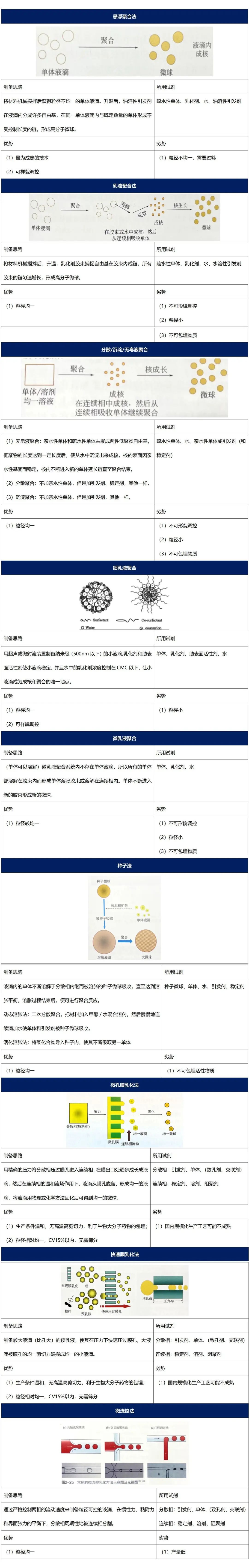 本篇将着重介绍以单体为原料制备、以高分子为原料制备的微球制备技术以及复合微球的制备和多孔微球的制备。 一、以单体为原料制备 1.制备思路该方法主要采用ST、MMA等单体原料制备聚苯乙烯(PST)微球、聚丙烯酸酯微球(PMMA)等微球。主要的制备思路:单体合成,单体带有双键,双键经过引发剂可引发自由基聚合形成高分子(也可以通过缩聚方式制备高分子)。悬浮聚合法、乳液聚合法、膜乳化法、种子法、微流控法等几种方法,其中,国内色谱层析介质的龙头企业纳微科技采用种子法制备微球。 采用上述几种制备方法获得的微球粒径大小如下图[1]: 2.以单体为原料制备微球所用试剂 以苯乙烯、丙烯酰胺单体为例,在制备微球过程中,通常会使用以下多种试剂: (1)稳定剂:PVA(聚乙烯醇,水溶性,常用)、PVP、CMC(羧甲基纤维素),主要作用是:分散剂或乳化剂,分散原材料至连续相,防止微球液滴粘连吞并 (2)引发剂:KPA(过硫酸钾,水溶性),主要作用是:预热分解成自由基开始链引发 (3)乳化剂:十二烷基硫酸钠、SDS,主要作用是:分散原材料至连续相,设计成核地点和机制 (4)阻聚剂:HQ、NaNO2,主要作用是:防止单体和自由基在设计以外的地方成核 二、以高分子为原料制备 该方法主要用于制备琼脂糖、壳聚糖、白蛋白等天然高分子微球或聚乳酸、聚己内酯等聚酯类生物可降解高分子微球。其原料聚乳酸、葡聚糖、琼脂糖等高分子材料。主要的制备思路:将高分子溶解在有机溶剂或水中制备成溶液,在和与之不相容的水或溶剂混合乳化,制备成O/W(水包油)、W/O、W/O/W或O/W/O型乳液后,用适当的物理或化学交联方法使液滴固化成微球和微囊。固化方法需要根据高分子的物理化学性质来选择或开发不同的方法。乳化方法主要包括:机械搅拌法、均质乳化法、膜乳化法;固化方法包括:自固化法、物理/化学交联法、溶剂挥发/箤取法、单/复凝聚法。其中,机械搅拌法方法较为常用。 1.乳化方法 2.固化方法 (1)溶剂挥发法:使用熔点低的溶剂,如二氯甲烷,常温减压使其挥发。该方法可用于制备聚酯类微球,脂质体和高分子囊泡。 (2)溶剂箤取法:使用水溶性高的溶剂,使溶剂可扩散进入水中被除去。该方法可用于制备聚酯类,琼脂糖微球。 (3)化学交联法:对高分子交联得到固化的微球。如:壳聚糖带有氨基,可采用戊二醛进行化学交联,除此外,葡甘聚糖,白蛋白也可采用化学交联法。 (4)物理交联法(离子固化法) 内部固化法:将会与酸反应生成阳离子的粉末加入材料中,将混合物滴入酸性水溶液,氢离子进入液滴内部与粉末反应生成阳离子并从内而外与材料交联固化。 外部固化法:将材料滴入含阳离子的溶剂,固化从微球表面向内部逐渐变慢。其优势为包埋率高,例如:海藻酸盐带有负电荷,可采用Ca2+等二价阳离子来物理交联。 (5)自固化法 冷却固化:通过冷却凝固成固体,常用于琼脂糖微球的制备。 高温固化:亲水性高分子蒸发去水分化使微球固化,可用于制备壳聚糖,琼脂糖,白蛋白,聚氨基酸等微球,其劣势为高温下药物容易失活。 (6)单凝聚法(沉淀法):材料在烯酸溶剂中溶解,滴加浓酸使其析出成球;或在材料中加入会蒸发的极性溶剂去除材料中的水;在材料可溶的溶剂里加入不可溶的溶剂使其析出。其优势在于可以避免戊二醛等化学交联剂的使用,可用于制备聚酯类,壳聚糖,海藻酸盐,白蛋白等微球。 (7)复凝聚法:两种带相反电荷的高分子材料,离子间交联形成复合微球或微囊,体系接近等电点而使溶解度降低,析出沉淀。其优势在于不使用有机溶剂和化学交联剂,保持包埋药物活性,药物在酸性条件下(例如胃部)不释放,可用于制备壳聚糖+海藻酸盐微球;其劣势为微球直径受滴管影响,难以大规模产业化。可用于制备壳聚糖+海藻酸盐微球,及壳聚糖+海藻酸盐/酪蛋白/明胶/聚磷腈、海藻酸盐+壳聚糖/聚赖氨酸/明胶微球等。 3.以高分子为原料制备微球所用试剂 三、复合微球的制备 最常用的复合微球是高分子磁性微球,医疗上主要用于IVD检测试剂、细胞筛选等用途。 1.以单体为原料制备高分子-无机复合微球 高分子-无机复合微球能够兼具高分子和无机材料两者的优势,既拥有有机材料的可塑性、易加工性及生物兼容性,同时具备无机物的刚性、磁性以及导电性等性能。制备方法较多,思路主要分为四类: (1)以无机颗粒为核,在核上进行单体聚合的方法 (2)以高分子微球为核,在高分子微球上原位生成无机颗粒的方法 (3)将无机颗粒和单体混合制备成液滴,然后通过聚合将无机颗粒包埋在微球内的方法 (4)利用静电相互作用等其他方法。 2.以高分子为原料制备有机-无机复合微球 以高分子为原料制备有机-无机复合微球,最常用的方法是悬浮法和细乳液法,制备思路均为将无机颗粒分散在分散相中,和连续相混合后,固化成球。区别在于悬浮法粒径较大,细乳液法粒径较小。 四、多孔微球的制备 多孔及高开孔微球在三维细胞培养、分离纯化介质等领域发挥着极其重要的作用。 常用的制孔剂有气体生成型致孔剂(如碳酸氢铵、碳酸氢钠、过氧化氢)、渗透型致孔剂(氯化钠、氯化钾等)和可提取型致孔剂(Pluronic,脂肪酸盐等)。造孔最常用方法为制孔剂浸出法,将制孔剂与原料相混合,并用溶剂将其浸出以形成孔结构。 在高分子中空微球的制备中,常用的制备溶剂为乙醇/二氯甲烷的混合液,间或混合异丙醇、丙酮