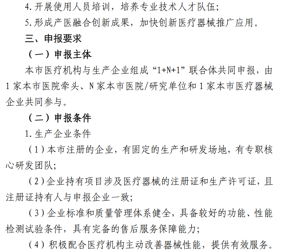 01 10类医疗器械,开展创新器械项目申报 近日,上海市经信委发布《上海市经济和信息化委员会 上海市卫生健康委员会 上海市医疗保障局 关于开展2023年上海市创新医疗器械应用示范项目申报的通知》(以下简称《通知》)。根据《通知》,为加快生物医药创新产品应用推广,支持创新医疗器械在医疗机构开展应用示范,形成“应用示范-反馈改进-水平提升-辐射推广”的创新迭代,提高上海市创新医疗器械性能质量,推动产业高质量发展,现就开展2023年上海市创新医疗器械应用示范项目申报工作。1.植介入器械;2.体外诊断仪器和试剂;3.医用成像器械;4.手术器械;5.治疗器械;6.诊察监护器械;7.康复器械;8.妇产科、辅助生殖器械;9.医用软件;10.其他医疗器械。根据《通知》,由上海市医疗机构与生产企业组成“1+N+1”联合体共同申报,由1家本市医院牵头、N家本市医院/研究单位和1家本市医疗器械企业共同参与。申报2023年上海市创新医疗器械应用示范项目的生产企业、医疗机构、研究单位需要满足一定的条件。例如,申报生产企业须为“本市注册的企业,有固定的生产和研发场地,有专职核心研发团队”,还要“企业持有项目涉及医疗器械的注册证和生产许可证,且注册证持有人与申报企业一致”。(2)产品主要工作原理或者作用机理创新性较高,具有较高临床应用价值;(3)对纳入《上海市生物医药“新优药械”产品目录》《上海市创新产品推荐目录》的产品予以优先支持。 配套支持方面,《通知》明确,对于列入应用示范项目的创新医疗器械、参与示范项目的单位,在申报高质量发展专项、申请配置相关设施设备、申请相关收费项目和纳入医保支付时予以优先支持。在国家或本市重点项目推介、金融支持、对外合作、宣传推广等方面予以优先支持。上述应用示范项目主要研究内容包含(根据实际情况可设置、划分子项目任务):1.对标先进同类产品,开展临床应用数据收集与对比评价,对功能、性能、可靠性、可用性、临床应用效果、经济性等进行临床验证;2.加快实施创新医疗器械在医疗机构内临床应用,结合各自领域研究建立产品使用规范、评价指标体系;3.医疗机构提出改进建议,生产企业改进提升医疗器械质量性能并提高服务水平;4.开展使用人员培训,培养专业技术人才队伍;5.形成产医融合创新成果,加快创新医疗器械推广应用。02 耗材集采全面扩围至今,较为成熟的存量市场逐一遭遇大砍价,一定程度上也倒逼企业加速创新,以更高的临床价值和优质产品换取时间窗口和议价空间。而创新医疗器械的应用推广还需支持。现如今,政策东风正在吹来。今年以来,上海市已接连发布多个文件,明确支持创新医疗器械发展。7月28日,上海市医保局、上海市经信委、上海市科学技术委员会、 上海市卫健委、上海市地方金融监督管理局 、国家金融监督管理总局上海监管局、上海市大数据中心等七部门联合发布《上海市进一步完善多元支付机制支持创新药械发展的若干措施》。《措施》提出,优化新项目试行期内医疗机构自主定价机制,鼓励医疗机构加快应用。完善临床新项目备案应用机制,对首次临床应用的新项目准予收费立项后,其他医院备案后即可收费。 要加快创新药械临床应用。调整优化医疗机构考核机制,医院不得以用药目录数量、“药/耗占比”等原因限制创新药械入院。 此外,加大创新药械医保支付支持。在DRG/DIP支付方面对创新药械予以倾斜,提高新技术应用病例支付标准,新技术应用高倍率病例不设控制比例,成规模新技术应用可独立成组。稳步扩大本市医疗服务项目和医用耗材医保支付范围,优先覆盖创新药械。7月10日,上海市医保局发布《上海市医用耗材纳入医保支付范围的工作规范(试行)》,其中明确,逐步将临床价值高、经济性评价优良的医用耗材纳入医保支付范围,用高质量的医疗保障水平,满足群众对新技术、新耗材的高品质医疗需求。此外,北京市医保局2022年发布的《关于进一步完善本市新增医疗服务项目价格管理工作的通知(暂行)》中规定,属于科技重大专项、重点研发计划及创新医疗器械的产品,具有自主知识产权的创新成果转化为诊疗服务的项目,医疗机构可不受试行期限制,及时向市医保局提出优先纳入统一定价和医保支付政策评估论证程序的书面申请。北京市医保局还在《关于印发CHS-DRG付费新药新技术除外支付管理办法的通知(试行)》中明确,决定试行CHS-DRG付费新药新技术除外支付管理办法。创新医疗器械审批也在提速。在国新办7月5日举行的新闻发布会上,国家药品监督管理局局长焦红指出,通过这些年药品、医疗器械产品的受理量、审批量,包括今年上半年的受理量和审评量,就能够明显看出我国的药品医疗器械创新成果已经进入了爆发期。国家药品监督管理局副局长徐景和谈到,下一步,国家药监局将持续跟踪医疗器械创新发展的新情况新进展,不断总结新经验、探索新规律、推出新举措,批准更多更好地创新高端医疗器械上市。根据国家药监局最新数据,截至目前,国家药监局已批准228款创新医疗器械上市。国产创新医疗器械正在加速爬坡,创新竞赛还将持续上演。