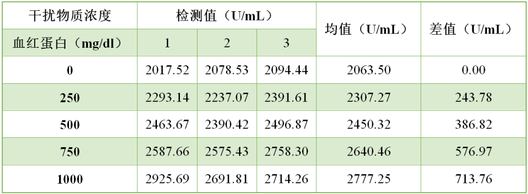 当样本中血红蛋白浓度≤238.36mg/dl、胆红素浓度≤37.56mg/dl或甘油三酯浓度≤671.96mg/dl时,对检验结果无干扰。