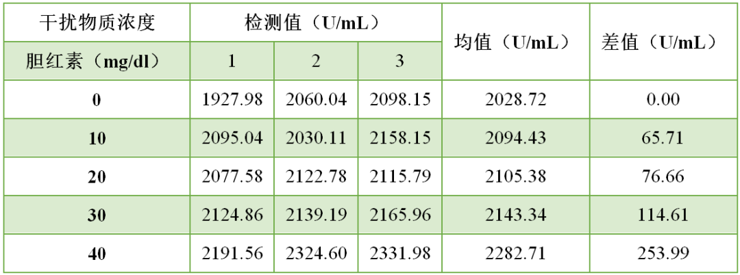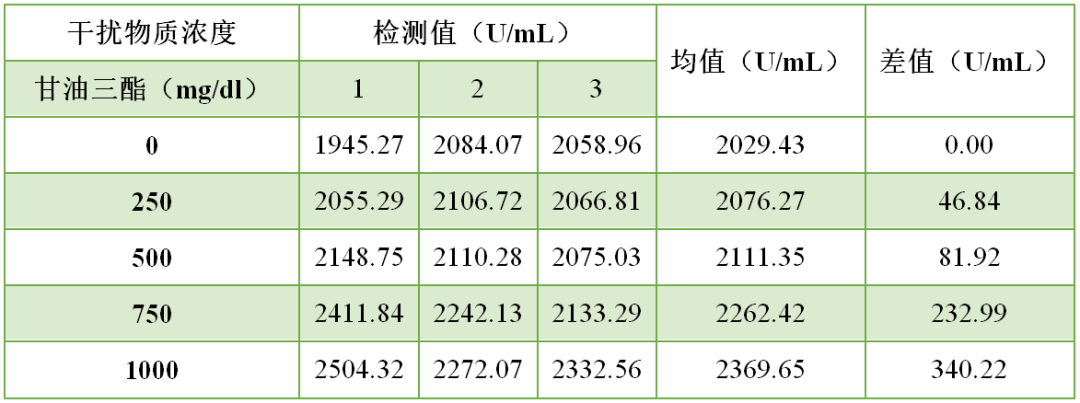 由上表可知血红蛋白、胆红素和甘油三酯均对样本中抗链球菌溶血素O的检测有干扰。