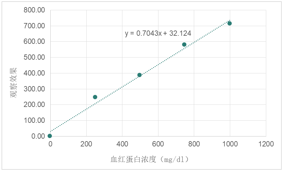 根据回归曲线可以得出血红蛋白的最小干扰浓度为238.36mg/dl。