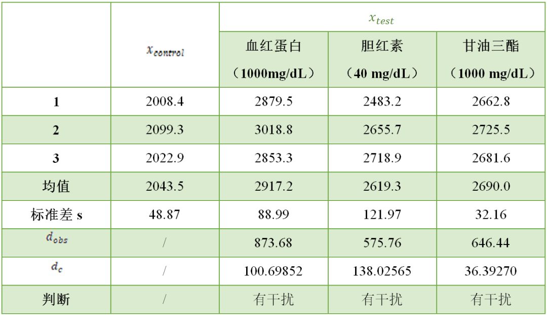 将可疑干扰物质加入基础样本池,计算实验样本相对于对照样本测量结果所产生偏倚,称此为“配对差检验”。如果可以观察到临床显著性影响,可以认为此种物质为干扰物质,需要进一步评估干扰物质浓度与干扰程度的关系。根据本产品和检验物质的特性,本次干扰试验以胆红素、甘油三酯、血红蛋白的干扰实验做统计检验。