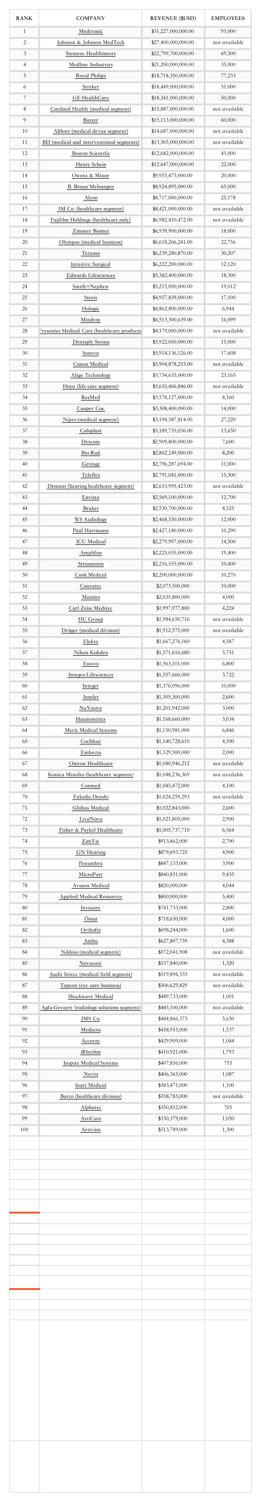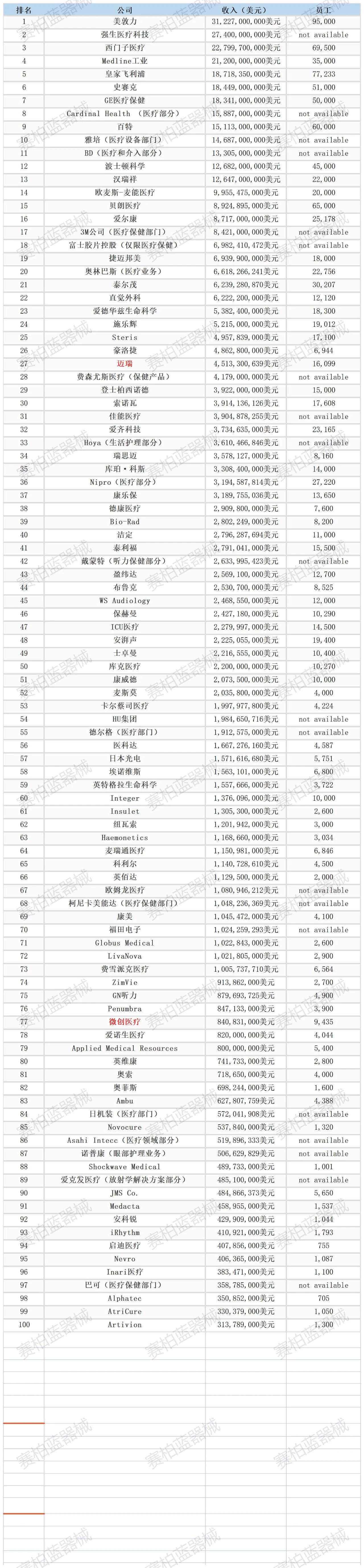 | 图| 拍信创意 最新全球械企百强榜出炉,两家中国企业位列其中。 01 2023全球医疗器械公司百强排名网站截图 作为中国企业的代表,迈瑞和微创均为第二次入选百强榜。其中微创排名77名,与去年保持一致;迈瑞排名27名,较上次实现了进步5名的突破。国产品牌在医疗器械领域的国际影响力逐步提升,未来这个榜单上也大概率会出现更多中国企业的身影。 迈瑞营收、净利双增长根据最新公布的营收数据,2023年上半年营收已经达到去年全年的60%。对于业绩增长,迈瑞将其归因于医疗新基建加速医疗器械市场扩容、国内医疗器械市场国产化进程加速、中国和发展中国家医疗器械市场增长迅速,以及公司在研发、生产、营销等方面的竞争优势。 海外市场方面,迈瑞在高端客户群的突破给也为业绩增长起到了推动作用。其中包括拟收购全球知名IVD品牌DiaSys Diagnostic Systems GmbH的75%等一系列规划,也为其布局海外供应链平台,实现全面国际化奠定坚实的基础。 8月30日,微创医疗发布截至2023年6月30日止6个月中期业绩,该集团取得收入4.83亿美元,同比增加25%;毛利2.88亿元,同比增加16%;公司权益股东应占亏损1.62亿美元,同比减少18%。 针对较上年同期显著增长25%(剔除汇率影响)的业务收入,微创指出,报告期内常规诊疗活动全面复苏,刚性医疗需求明显反弹,多科室手术量快速提升。且受益于全球化持续加深、新产品加速推出,及需求端快速增长。 具体为:微创脑科学(神经介入业务)收入同比增长45%、心血管介入业务收入同比增长42%、心通医疗(心脏瓣膜业务)收入同比增长41%、心脉医疗(688016)(大动脉及外周血管介入业务)收入同比增长36%、微创机器人(300024)(手术机器人业务)收入同比增长3,110%、骨科医疗器械业务收入同比增长10%(其中中国市场收入同比增长51%)、心律管理业务收入同比增长5%(其中中国市场收入同比增长51%)及新兴业务收入录得倍数增长。 销售收入增长,裁员问题浮现然而在这积极繁荣的景象背后,医疗器械行业的裁员问题也逐渐暴露。根据MassDevice,自2022 年中期以来,整个行业裁员约18000人(截至2023年5月)。 在医疗器械百强榜单中,员工总数减少了近7%,降至118万人。Medical design and outsourcing指出,这反映了医疗器械行业在面对更高的运营成本和健康服务提供商的运营问题时,开始进行的裁员。 作为百强榜单的一部分,Medical design and outsourcing还同步将CEO的薪酬进行了排名以及分析,并将其与员工的进行了对比。 在报告中,Medical design and outsourcing重点选取了51家公司进行了分析,其中CEO和高管的平均年薪为1020万美元,员工平均工资中位数为76068美元,提交委托书的公司的平均工资比率为220:1。 尽管差值较大,但CEO们也在面临减薪压力。例如美敦力的董事长兼首席执行官Geoff Martha在 2023 财年的收入为1540万美元,较2022年减少了14%。报告指这主要是因为其今年没有根据美敦力激励计划获得任何好处。 与降薪裁员对应的是,入选百强榜的公司在研发投入方面较以往有明显提升,披露研发支出的62家公司合同比增加了44亿美元以上(即19.8%),达到264亿美元。可见,研发能力是医疗器械企业的安身立命之本,尤其在现阶段这个相对成熟的市场,创新对于长远发展重要性更是无需赘言。 值得注意的是,此次百强榜单中共有三家医疗器械公司将其收入的20%以上用于研发,其中微创以“49.9%”的数据位居榜首。 本身就依托庞大的市场,再加上研发方面的持续投入。长此以往,未来将有越来越多中国产医疗器械有望迈入国际顶级巨头之列。 附: |