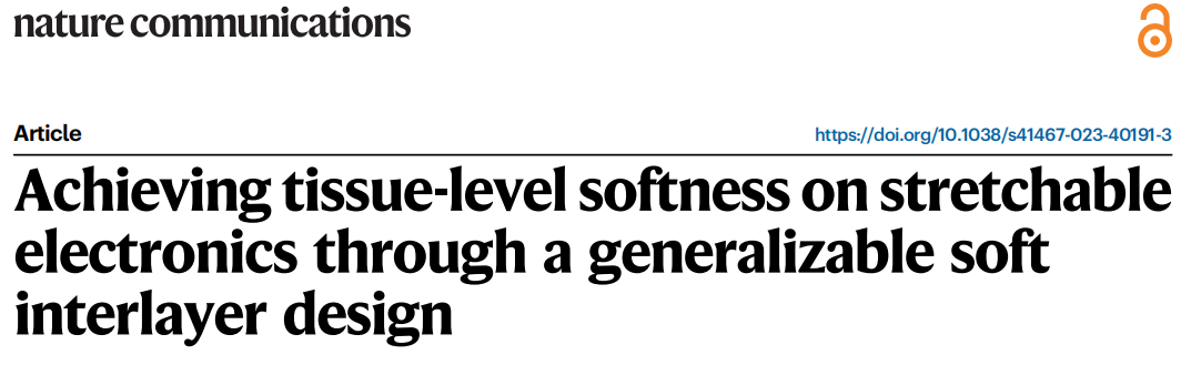 将电子设备作为可穿戴或植入式设备与人体相连接,为健康监测、疾病治疗甚至基础生物学研究提供了大量功能。为了实现无缝和贴合的接口,必须尽量减少电子设备与人体皮肤/组织之间的机械不匹配,其中两个主要方面是柔性(即杨氏模量)和可拉伸性。虽然可拉伸性的实现通常伴随着杨氏模量的降低,但这些可拉伸电子材料和器件的模量仍然比大多数柔性生物组织高3-4个数量级。进一步减少这种模量不匹配对于实现长期稳定的生物界面是非常重要的。首先,机械方面,理论和实验都表明,组织级模量可以显著提高可拉伸装置在非零高斯表面(如人体皮肤或组织)上的贴合性。其次,免疫方面,生物植入物的组织柔软度可以显著抑制对可植入装置的异物反应(FBR) 。总的来说,一个贴合且无疤痕的组织界面对于和调节信号转导的保真度非常重要。 近日,一组来自芝加哥大学和UCLA的研究团队在杂志Nature Communications上发表了一篇题为“Achieving tissue-level softness on stretchable electronics through a generalizable soft interlayer design”的文章。在这项工作中,作者报告了一种可推广的柔性中间层设计,当将其添加到功能层和基底之间时,可以允许使用现有的可拉伸电子材料来构建组织级模量器件,同时实现高拉伸性。利用这种设计,作者展示了一种基于PAAm水凝胶衬底的可拉伸晶体管阵列,其有效杨氏模量为5.2 kPa,比传统的器件软两到三个数量级,可以与动态软表面(如具有非零高斯纹理的皮肤)形成更舒适、稳定和不易察觉的接触。 图片来源:Nature Communications 柔性中间层设计的工作机理 作者通过对由功能薄膜、柔性中间层和超软基底组成的三层结构进行有限元分析(FEA),从理论上研究了中间层的力学功能。在功能膜中引入一个切口,并绘制缺口周围的应力水平图(图a)。结果显示,切口周围的模量越高、夹层厚度越大、分层程度越轻(即粘连性越好),都可以抑制功能层的应力集中(图b-d)。 研究团队通过实验验证了SEBS H1052 (2.83 MPa)可以作为理想的中间层,与超低模量基材(例如水凝胶)具有强粘附性。采用这种中间层设计,即使只有200 nm厚的SEBS中间层,100%应变下半导体薄膜中的拉伸裂纹尺寸和密度明显减小,进一步将SEBS层增加到2 μm有助于实现更少的裂纹扩展(图f)。半导体薄膜的载流子迁移率的变化趋势(图h)也反映了这种SEBS中间层显著提高的拉伸性。 柔性中间层显著提高功能层可拉伸性。 图片来源:Nature Communications 采用柔性中间层设计的超软晶体管 作者尝试使用柔性中间层设计在可拉伸晶体管上实现类似组织的柔软性。采用PAAm水凝胶(200μm,模量2.58 kPa)作为基底,以及SEBS作为柔性中间层,得到的晶体管厚度为200μm,杨氏模量低至14.4 kPa。两个方向的100%应变下,即使重复拉伸1000次,柔性中间层的高拉伸性也能确保稳定的载流子迁移率(图c,d)。 通过在SEBS软中间层上预先设计空间图案有助于有源矩阵实现更低模量,可低至5.2 kPa模量(图g),比之前报道的传统弹性体基底(厚度为100 μm)上的可拉伸晶体管阵列软两到三个数量级,同时保持了相似的可拉伸性。 超软可拉伸晶体管和有源矩阵电路采用柔性中间层设计。图片来源:Nature Communications 超软器件增强了贴合性并减少了机械约束 组织级柔软度的实现可以极大地提高附着在动态皮肤/组织表面上的电子设备信号转导质量的同时,降低不适感。贴合性的改善在非零高斯曲面上得到了证明,如图c, d所示的人类手腕表面。超软设备在皮肤变形下可以更好地遵循原始皮肤表面纹理,这意味着更低的不适感和更好的贴合性。 此外,低杨氏模量的装置最大限度地减少了对柔软皮肤和组织运动的机械约束。低机械约束的好处在包裹变形软组织的情况下更为明显,例如周期性膨胀的血管(图f)。与传统器件(图g右)所看到的明显约束相比,当被超软晶体管阵列包裹时,血管可以更好地保持其原始膨胀程度(图g中)。 超软器件增强了贴合性并减少了机械约束。 图片来源:Nature Communications 超软器件的生物相容性表征 对于植入式应用的生物相容性,作者比较了三种类型样品上的FBR:水凝胶膜、SEBS膜和SEBS-水凝胶双层样品。这些样品被植入小鼠皮下1个月,以分析组织反应。如图d所示,双层植入体的瘢痕组织(18.3μm)比SEBS植入体(51μm)薄,与水凝胶植入体(15.4μm)相似。结果表明,长期的免疫相容性确实可以从植入物模量的降低中获益。 研究团队进一步将中间层设计应用于超软可拉伸电生理(EP)记录设备(图e)。该设备的超低模量表现出两个主要优点。首先,该设备与心脏表面保持相对稳定的附着,由于心脏跳动而产生的位置移动最小(图f-top),这对于在心脏表面进行长期空间分辨率的ECG记录/映射非常重要(记录的ECG信号如图g-top)。其次,超软装置对心脏跳动的机械约束较低,LVP稳定且增幅最小(图h)。这种益处对于使用慢性集成设备进行微创和稳定的心脏测绘是很重要的。 Ultrasoft设备具有抑制免疫反应和与活体组织的机械兼容性。图片来源:Nature Communications 总结 作者展示了一种通用的柔性中间层设计,该设计允许具有相对高模量的可拉伸功能材料用于制造超软和可拉伸电子产品。通过实现均匀的应变分布,该设计可以显著提高基底上功能层的可拉伸性,其模量降低了几个数量级。通过将可拉伸半导体集成到超软基底上而不影响可拉伸性,这种中间层设计使模量低于10 kPa可拉