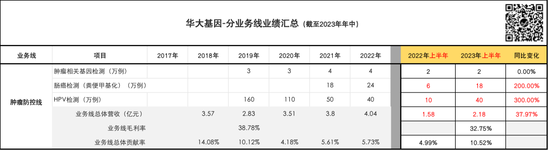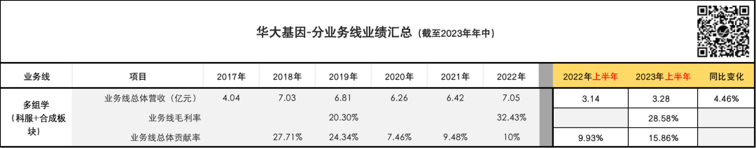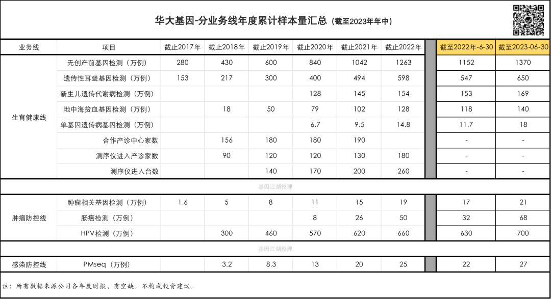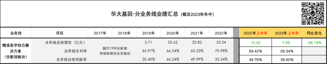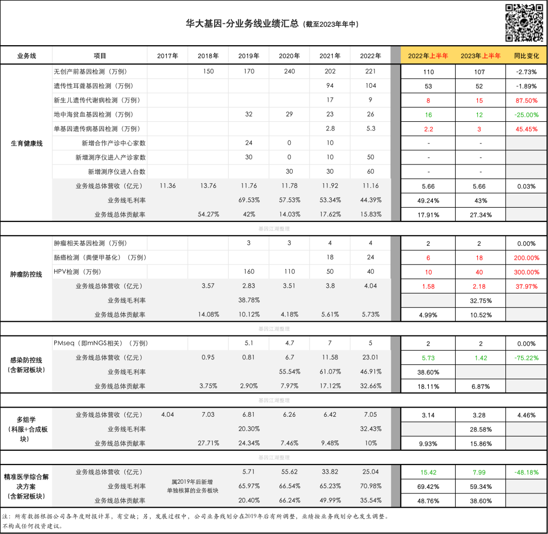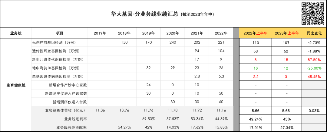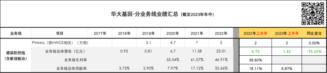 ...... 直觉对了吗? 我觉得很对,这是一个基本的、线性的逻辑判断。 客观时代背景造就的趋势,并不以企业或个人的意志为转移。 但这并不意味着我们就只能毫无作为。 我们再来拆解一下华大基因这并不算漂亮的半年报,看看数字背后都意味着什么: (为方便大家自行分析,贴出了原始数据,所有数据取自BGI在业务报表或官方公众号推文中公开披露的数据;相较“📎 起底华大基因”,主要增加了2022年、2023年半年度销量数据;且分析侧重点有所不同。)