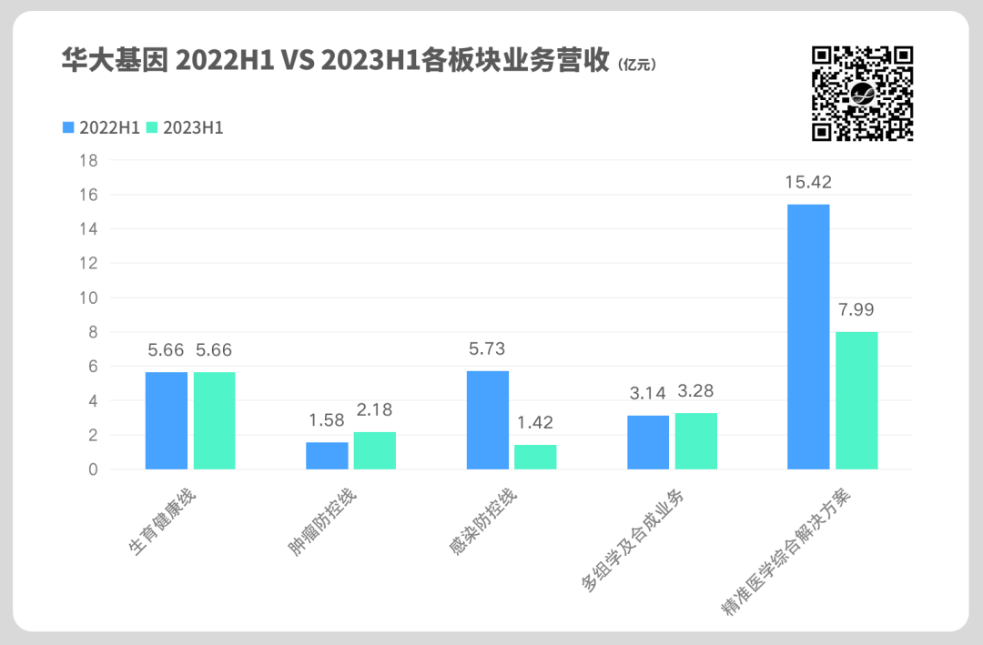 但人口的趋势不可逆转,如何补救? (1)产品升级,加速低毛利产品(NIPT)向高毛利产品转化(NIPT Plus); (2)相近赛道,进多种产品(新筛、地贫、单基因病等项目),摊薄渠道成本: 测序+质谱的方案,以及完整的出生缺陷三级防控的检测体系、产品资质,华大基因在生育健康领域的优势依然显著。 2. 肿瘤防控线:早筛+民生项目开始放量 肿瘤相关基因检测样本量较上年同期依然持平(~2w→~2w,0%),但肠癌检测(6w→18w,↑200%,≈2021全年检测量)、HPV检测(10w→40w,↑300%,≈2022全年检测量)迎来快速放量期,从而支撑起整体业务板块总营收高达37.97%的增长。 这依然和我们的体感相近:基于大小Panel的肿瘤基因检测还在路上,而性价比更高的肿瘤早筛项目已渐行渐近。(📎 又卖15万例?金域奇袭肿瘤早筛市场 ) 但即便是高达37.97%的增长,就能否下结论“肿瘤防控线就会成为华大基因新的发展引擎”? 这个结论可能为时尚早(该板块业务营收占比不高,10.52%),但值得期待(早筛项目若继续高速放量)。 此外,华大基因旗下天津门诊部的成立及互联网医院牌照的获取,为该板块toC业务的进一步发展创造了更多的可能性。 3. 感染防控线:新冠业务出清,常规业务平稳,新品上市 除去新冠非常规业务,mNGS样本量较上年同期依然持平(~2w→~2w,0%)。 但今年的mNGS市场有重大变化,以靶向富集的tNGS产品一炮而红,除微远、杰毅、金匙、予果等明星企业外,还有金域、迪安、艾迪康、华银等传统ICL企业涌入市场,市场格局重新迎来混乱局面。(📎 一年卖出17万tNGS背后:金域们向左,微远们向右 ) 华大基因近期也发布了自己的tNGS产品: 市场反响如何,尚待观察。 4. 多组学板块:单细胞及空间多组学带来新的市场变量 该板块上半年总营收同比微增(3.14亿→3.28亿,↑4.46%); 对比该板块龙头公司诺禾致源(9.3亿,较上年同期增长 9.44%),无论是营收规模还是增速,华大基因都难言优秀;诺禾致源的增长多来于港澳台及海外地区(4.6亿,占比约50%),同比增长高达 30.79 %,这对该领域内的公司应有借鉴意义。 市场层面,以单细胞及空间多组学技术为基础的科学研究日益火热,华大首提的“时空组学”概念也深入人心,并在CNS顶刊发表标志性文章。 所以,受益于集团内兄弟单位的支持,华大基因事实上有工具及成本优势,但业务层面能否更进一步,待观察。 5. 精准医学板块:每一家新合作的实验室就是一处源源不断的营收来源 按财报披露,该领域的业务范畴指的是: 按该释义,该板块业务与其他临床板块业务相互支撑。往年,该业务板块包含大量新冠相关业务,“火眼”实验室即在其中。 根据8月14日的华大基因投资者关系活动记录表中关于投资者的回复,“今年公司营收仍包含少量非常规收入,主要系部分地区结算周期不同所致”。除去这少量新冠业务,剩下部分应成色十足。 且每布点一家合作实验室,就有希望创造了一个源源不断的营收来源。这是卖水生意模式最吸引力的地方。 看完这5大业务板块,我们能发现什么? 5大板块并不是全面开花、齐头并进,而是有下跌、有维稳、有眼前一亮的局部增长,无论下跌或增长,都与我们在市场中的感受相近。 真实境遇就是这样,环境巨变,龙头也无法独善其身,龙头也需要闪转腾挪。 从来没有一个一望无际的蓝海、一片取之不尽的金矿就摆在我们面前; 更现实的情况是: 大家辛辛苦苦种地,水稻价好就多种水稻,玉米淹了就补种豆子,最终收成还得盼老天天气。 增长从何而来? 这仍然是最关键的问题。 人们只会为最终结果买单,并不会管你过程如何。 从国内市场来说,有一些事情正在发生,影响两面: