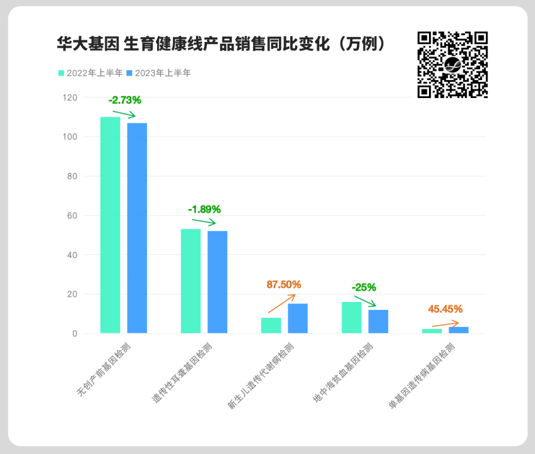 该板块总体营收相较上年同期增长0.03%,几同于无。这是否意味着华大基因在最核心的业务板块上已经停滞? 拆解来看,事实上其业务板块产品结构和营收来源已发生了改变: 核心单品NIPT样本量有所下降(110w→107w,↓2.73%),地贫基因检测也下降明显(16w→12w,↓25%);而新生儿遗传代谢病检测(8w→15w,↑87.5%)、单基因遗传病检测(2.2w→3w,↑45.45%)补住了窟窿,重新扛起了增长的大旗。 NIPT的销量增长放缓或下滑,其实是在意料之中,尤其是对占有最大市场份额的华大基因来说,新生人口下降趋势的影响尤甚。对华大而言,能维持现有的样本体量,实则并不容易。