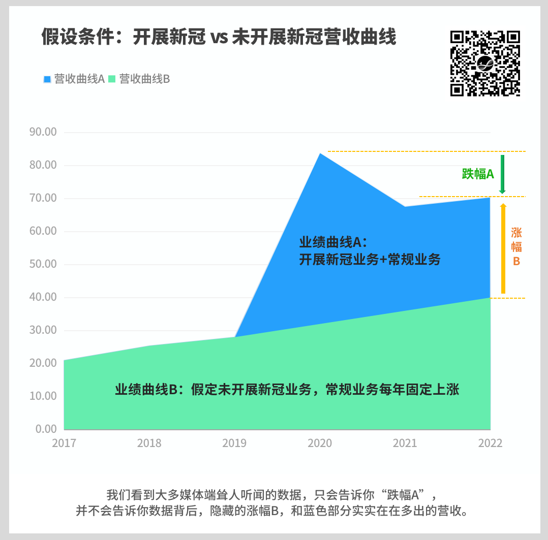 2019年,华大基因彼时全年营收仅为28亿,而2020年,华大基因全年营收暴涨至近84亿。 华大业绩腾飞的故事,就是从这里开始; 但开始的初衷,未必是生意。 我们会想当然的认为,像华大这样体量、这样背景的公司,抓住新冠检测的红利不是理所当然吗? 事实远非如此。 三年间,又有多少企业、多少人在犹犹豫豫中错失时机,然后在事后扼腕痛惜。 没有什么是理所当然,有的只是审时度势与当机立断,或出于社会责任担当、最后却缔结生意的“无心插柳柳成荫”。 2020年3月17日,汪建从武汉回到深圳结束14天的隔离,第一次接受媒体采访,在被问到该如何思考应对公共卫生突发事件时的回复。 一个最直接的拷问: 时间回到三年前的那一刻,你会在一切未知、甚至关乎生死的情况下,义无反顾地背着书包北上武汉吗? 这就是华大这家企业特别的地方,这也是老汪的可敬与率性之处。 回到业务本身,今天我们看到的所有新冠相关企业的跌幅,也只是业务的正常回归,不用放大焦虑。以一个图进行直观的展示: 因为暴涨,所以暴跌; 但一涨一跌间,跨越三年期的红利,扎扎实实地吃进了肚子(图中蓝色色块区域)。 仓廪盈实,以御寒冬。 如果说谁能在这漫长的冬天活下去,我相信是这些储备丰盈的企业。 这是暴跌的悲观数字下的第一个常识。 “常识”视角下的常规业务理解 我们的第一直觉往往很准。 直觉告诉我们: