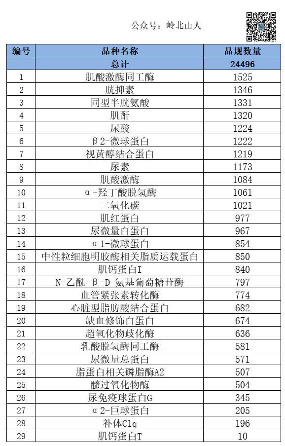 为做好肾功和心肌酶生化类检测试剂集中带量采购工作,现将企业填报的肾功和心肌酶生化类检测试剂予以公示,有关事项通知如下:企业自主填报的肾功和心肌酶生化类检测试剂,包括品种名称、注册证编号、产品名称、包装规格、适用机型、是否属于生化试剂等(详见附件)。1.本次集采为单品种液体生化诊断试剂,不包括品种大于或等于2种的联合诊断试剂、干性试剂、试纸条和按药品管理的诊断试剂。在采购范围内的肾功和心肌酶生化类检测试剂,将作为下一步医疗机构填报历史采购数据和需求采购量的基础数据。2.请有关生产企业认真核对公示内容,不在附件内但是属于本次集采范围的产品,可按照2023年8月18日《关于开展肾功和心肌酶生化类检测试剂信息填报工作的通知》要求,网上补充填报产品信息。3.在附件内但是不属于肾功和心肌酶生化类检测试剂的产品,或公示内容有错误的产品,请企业登录药品和医用耗材招采管理子系统,进入“耗材交易结算—业务办理管理—业务办理查询”界面,新增业务类型“耗材—肾功和心肌酶生化试剂公示”,提交加盖企业公章的材料,说明需要修改完善的信息。4.包装计量单位影响医疗机构报量和投标竞价分组,需要修改的请于本次公示期间提出变更申请,逾期原则上不予受理。通过数据分析,此次有215个厂家参与信息填报,和2022年肝功集采填报厂家216家基本持平。品规合计24496个,其中北京九强、美康生物两家的填报数量超过1000个。 在项目上,CK-MB,CYSC、HCY、CR等11个项目的品规数量超过1000个。