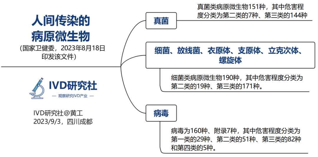 国内临床微生物检测产业,近二十年来取得很大发展。从手工到半自动单机,再到全自动单机、流水线,国产厂家在崛起。微生物检验仪器,在所有IVD仪器序列中,自动化发展是较慢的一支。因为微生物标本来源丰富、种类多样、采集容器各异,在过去几十年里,很难建立统一的检测标准。检测标本有呼吸道、肠道、生殖道、无菌体液、组织标本等各种类型,与标本对应的前处理流程和培养基种类差异也很大。近年来,随着各类信息技术和先进制造工艺,与微生物检验技术的交叉渗透,微生物检测仪器变得更加先进了。和其他IVD仪器一样,微生物检测仪器,同样经历了从手工、半自动,到全自动、流水线、智能实验室的发展阶段。和生化、免疫 、分子、血球等常规仪器不同的是,微生物检验仪器,检测标本是微生物,而非人体细胞及细胞内物质。检测对象不同,检测方法也随之而异。《临床检验装备大全:仪器与设备》指出,引起人类感染的病原微生物,包括8大类:真菌、细菌、放线菌、支原体、螺旋体、立克次体、衣原体、病毒。前6种可用培养方法检测,根据临床需要做药敏试验;后2种难培养或不能培养,需用免疫学、分子生物学方法检测。见图1。微生物诊断产品,都有哪些?黄工综合行业标准、教材研报、业内文章,画了一张《微生物诊断产品系统图》(图2)。根据《临床微生物检验基本技术标准》(WS/T 805—2022),以及临床微生物专家观点,微生物检验技术,分成四大类:染色镜检;微生物培养、鉴定和药敏检测;免疫学检测;分子生物学检测。微生物检验仪器,主要解决:标本中,有无目标微生物?有的话,是哪一种,药物敏感性如何?(一)按检测方法学划分,有8大类,见图2。包括:自动标本前处理系统、血培养/微生物培养系统、微生物鉴定药敏分析系统、飞行时间质谱鉴定系统、分子检测系统、免疫分析系统、厌氧培养装置、自动染色仪。当然还有配套的,培养瓶、培养基、药敏测试板卡等耗材及相关检测试剂盒。(二)按NMPA医疗器械注册法规,传统微生物检测仪器分8大类。包括产品描述、预期用途、注册名称、管理级别等,见图3。2022年11月2日发布的《临床微生物检验基本技术标准》中,明确微生物检验基本技术包括染色技术、显微镜检查技术、接种技术、培养技术、鉴定技术、分子检测技术和免疫学检测技术等。以下图4、图5,是对分子、免疫检测技术特点的概述。△图5:微生物免疫学检测的标本类型、检测方法及技术特点