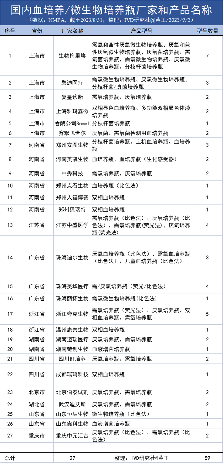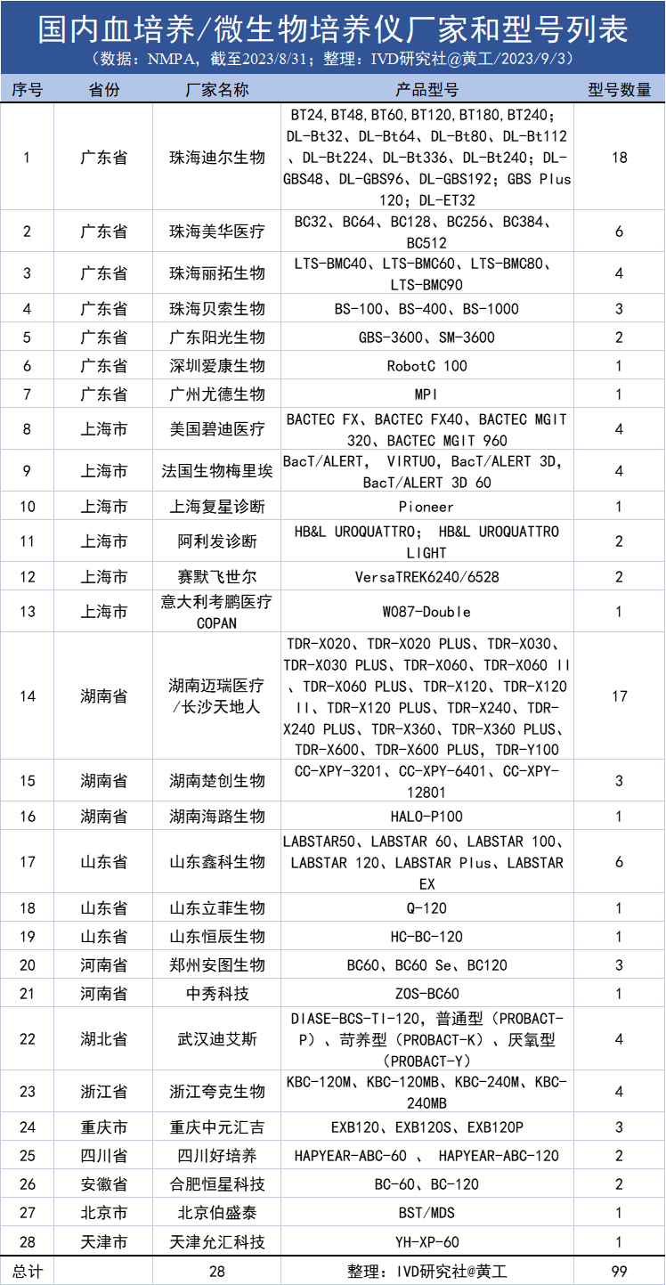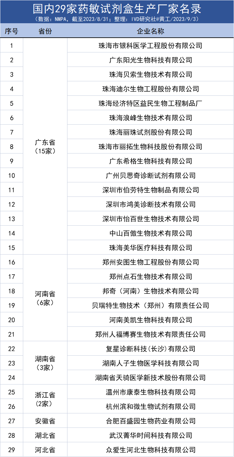 (2)国内:郑州安图生物、北京天坛药物生物公司、杭州微生物试剂公司、杭州滨和微生物、温州康泰生物、珠海迪尔生物、山东鑫科生物、上海星佰生物等。另外,还有一些药敏试剂盒生产企业,总体以广东、河南、浙江三省为主。到2023年8月底,搜索NMPA注册证数据库,关键词:药敏试剂盒/药敏检测试剂盒,国内注册证78张。对这78张注册证,做些统计。发现,广东有32张,占41%;河南25张,占32%;浙江10张,占13%;其余省份占14%。注册证数前5的,是郑州安图生物、温州康泰生物、珠海银科医学、珠海迪尔生物、广东阳光生物。29家药敏试剂盒厂家名录,见下图。以上是三类单机微生物检测系统。从注册证获批地、型号数量及交叉企业来看,法国生物梅里埃、美国BD医疗,是第一梯队,拥有丰富的微生物检测仪器、试剂和耗材综合解决方案。而赛默飞、贝克曼,在微生物领域不像其他IVD板块强势,更多靠收并购补齐产品线。国内的还是以珠海、郑州两地为主,主要企业,以安图生物、迪尔生物、长沙天地人、美华医疗、鑫科生物,在国内微生物检测领域,一直处于国产系统自研的探路者和中流砥柱的角色。
