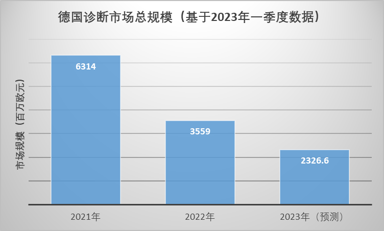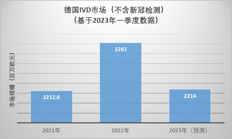 近日,德国诊断行业协会 (VDGH)发布基于一季度市场调研数据,并估算德国2023年的IVD市场规模,具体如下:1、诊断市场总规模约为23.27亿欧元,同比2022年下降34.6%。2、IVD市场规模(不含新冠)约为22.14亿欧元,同比2022年下降2.1%。3、试剂市场总规模约为19.79亿欧元,同比2022年下降38.1%。预计2023年德国IVD试剂的细分市场中,免疫诊断试剂约占32%,生化检测约占23%,传染病检测约占21%,临检市场约占13%,微生物检测(培养)检测约占9%,基因检验约占2%。1)免疫检测试剂市场规模约为6.32亿欧元,同比2022年增加3.2%。其免疫检测项目请见文件:GIVD-12 Immuno-Chemistry 2)生化检测试剂市场规模约为4.45亿欧元,同比2022年下降6%。其生化检测项目请见文件:GIVD-11 Clinical Chemistry3)传染病检测市场规模约为4.17亿欧元,同比2022年下降74.6%。其传染病检测项目请见文件:GIVD-15 Infectious Diseases 4)临检检测试剂市场规模约为2.6亿欧元,与2022年持平。其临检检测项目请见文件:GIVD-13 Haemat.Haemostas. Immunohaem. Histol. Cytol.5)微生物检测试剂(培养)市场规模约为1.81亿欧元,同比2022年增加5.6%。其微生物检测(培养)项目请见文件:GIVD-14 Microbiology Culture6)基因检测市场规模约为0.44亿欧元,同比2022年增加20%。其基因检测项目请见文件:GIVD-16 Genetic Testing 4、设备/耗材市场规模约为1.84亿欧元,同比2022年下降12.9%。5、实验室检测市场规模约为1.66亿欧元,同比2022年下降11.6%。6、售后/备件市场规模约为1.59亿欧元,同比2022年增加14.9%。【1】IVD-Markt nach Segmenten - 1. Quartal 2023 - Schätzung der VDGH-Arbeitsgruppe Marktforschung【2】GLOBAL IN VITRO DIAGNOSTIC (GIVD) CLASSIFICATION – VERSION 2023 编辑:Jason | 校对:Harris | 责编:Hillson公司简介