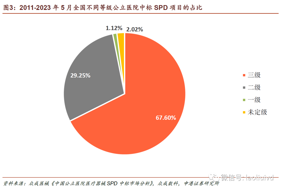 根据众成医械数据,2011年至 2023年 5月期间,全国共有近 700家公立医院公开SPD的中标项目。从公立医院的等级分布来看,三级医院占比为 67.6%,其中三级甲等医院占比高达 71%;二级医院占比近 30%,其中,二级甲等医院占比高达 87%。