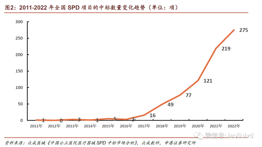 图片来源:建发致新招股书 SPD的主流模式 1、纯软硬件销售模式,医院直接购买纯软硬件产品(这种模式相对较少,一般医院不会为软件买单,更多是打包商购买软件硬件)2、医药商业公司集配模式,将医院的供应商归集到一家或几家,由其中一家进行SPD 运营管理服务,如上海医药、国药控股、九州通等;(这种模式目前是主流的方式)3、医药商业公司服务模式,由一家供应商为医院提供SPD 运营管理服务,向其他供应商收取服务费,这种模式更多的不是收服务费,而是直接从这个公司走一道,赚取差价,这个也是目前很多企业转型的方向。 4、纯第三方服务模式,由独立于医院与供应商的第三方SPD运营服务商提供SPD运营管理服务,如国医科技、塞力医疗、峰禾科技、联众智慧,江苏朋岳等,这种商业模式的利润空间相对于比较小,运维成本也相对比较高,第三方服务模式也是越来越多的医疗企业开始选择,相对于医药商业公司而言,更加的公平干净。二、SPD市场情况如何? 根据众成的数据来看,2011年至 2023年 5月期间,全国公立医院医疗器械 SPD项目的中标数量累计接近 900项,呈逐年增长的趋势,在 2022年达到 275项。2023年 1月至 5月共有 119项,同比增长 25.26%。