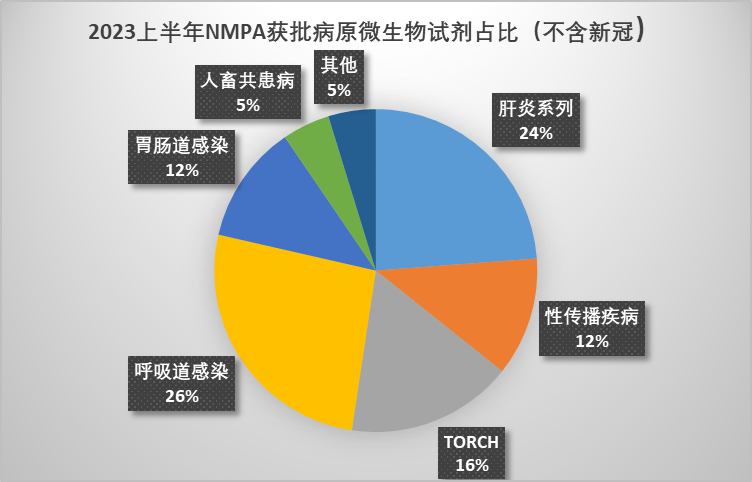 据国家药品监督管理局最新公布的数据,在2023年1-6月份获批的IVD产品中,境内注册产品占92%,境外注册产品仅占8%。其中病原微生物检测(含新冠检测)高居首位,约占47.9%,呼吸道项目最多;在18种方法学中,化学发光法位居首位,约占31%。 据统计,病原微生物检测约占48%(共57项),不含新冠的检测试剂约占35.3%(共42项),根据病原体进行细分,具体如下: 1)呼吸道感染: 获批试剂最多,约占26%;不计新冠试剂,肺炎支原体和烟曲霉注册的试剂约占呼吸道感染试剂的72.7%。其余为腺病毒、甲流和结核。 2)肝炎系列: 约占24%;乙肝、丙肝注册的试剂约占80%。甲肝和戊肝占20%。在肝炎系列中,化学发光法占60%。 3)TORCH: 约占16%;弓形虫、风疹病毒、巨细胞病毒、单纯疱疹病毒均为化学发光法。 4)性传播疾病: 约占12%;梅毒和艾滋病检测,化学发光法约占40%。 5)胃肠道感染: 约占12%;幽门螺杆菌占80%,诺如病毒占20%。均为胶体金法。 德国维润赛润原料产品手册 Virion-Serion TORCH系列原料手册 2023 .pdf 来源:NMPA、优咨康 公司简介 |