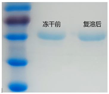 实验4:通过聚丙烯酰胺凝胶电泳比较冻干前后单位体积内的蛋白含量,数据如下: 图5 冻干前复溶后聚丙烯酰胺凝胶电泳图