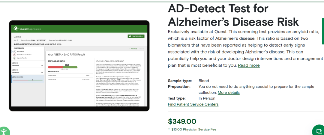 自产品推出后,Quest提供的这项产品风评不一。有些专家担心Quest的提供测试的标准过于宽松,很可能会产生大量的假阳性结果,为此,Quest也修改了几项测试标准,比如,在最初,患者在订购测试时不需要确认是否存在认知功能障碍或下降的症状,而现在需要要求患者确认他们是否存在轻度认知功能障碍或认知能力下降的症状,以及至少一个额外的风险因素,如家族病史、过去的脑部创伤或头部受伤,或过度饮酒等。除此之外,Quest还把测试的推荐年龄界定在50岁以上等。 不过,目前也还没有一款阿尔茨海默病血液测试产品获得FDA批准。但近年来,阿尔茨海默症液体活检发展迅速,有一部分原因是FDA批准了Biogen的阿尔茨海默病药物Aduhelm(aducanumab)和Eisai的阿尔茨海默病药物Leqembi(lecanemab),带动了阿尔茨海默症筛查研究的进展,在未来,医生可以通过阿尔茨海默症筛查测试来判断患者病情,从而有针对性地进行用药。 除此之外,随着全球人口老龄化的发展趋势,对阿尔茨海默症检测有需求的患者个体也将不断增长,根据《2022年中国阿尔茨海默病报告》,2019年我国约有1314万阿尔茨海默病患者;预计到2050年,这一数字将超过2800万。同时,阿尔茨海默病的传统检测如PET扫描复杂且昂贵,而脑脊液测试为侵入性手段,群众接受意愿低,尤其对于未患病的筛查者,其依从性更低。因此,无创阿尔茨海默症液体活检产品市场辽阔,相信第一款阿尔茨海默症液体活检筛查产品获批也将不远。 |