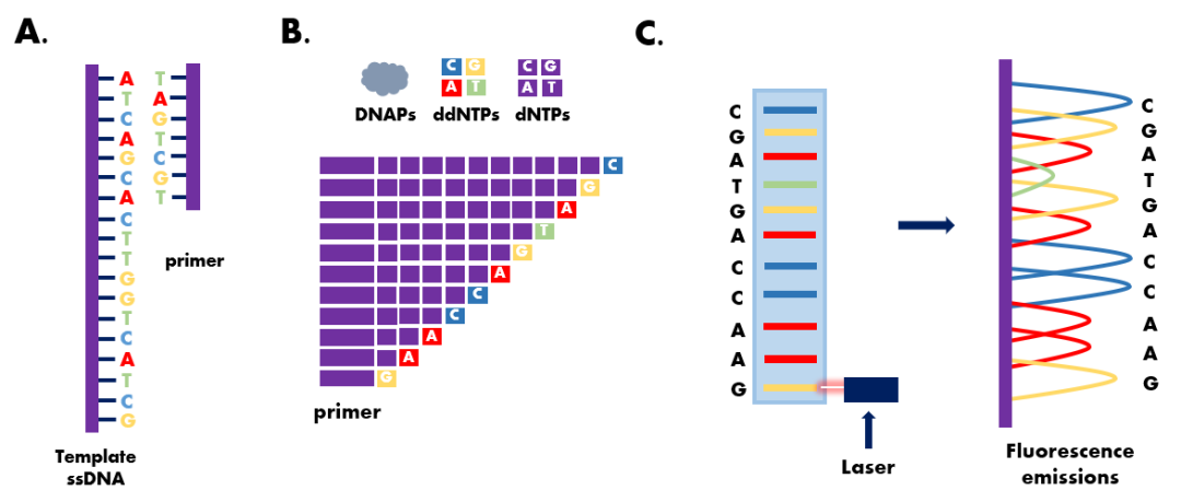 其巧妙的利用DNA复制原理,利用ddNTP来部分代替常规的dNTP作为底物进行DNA合成反应。