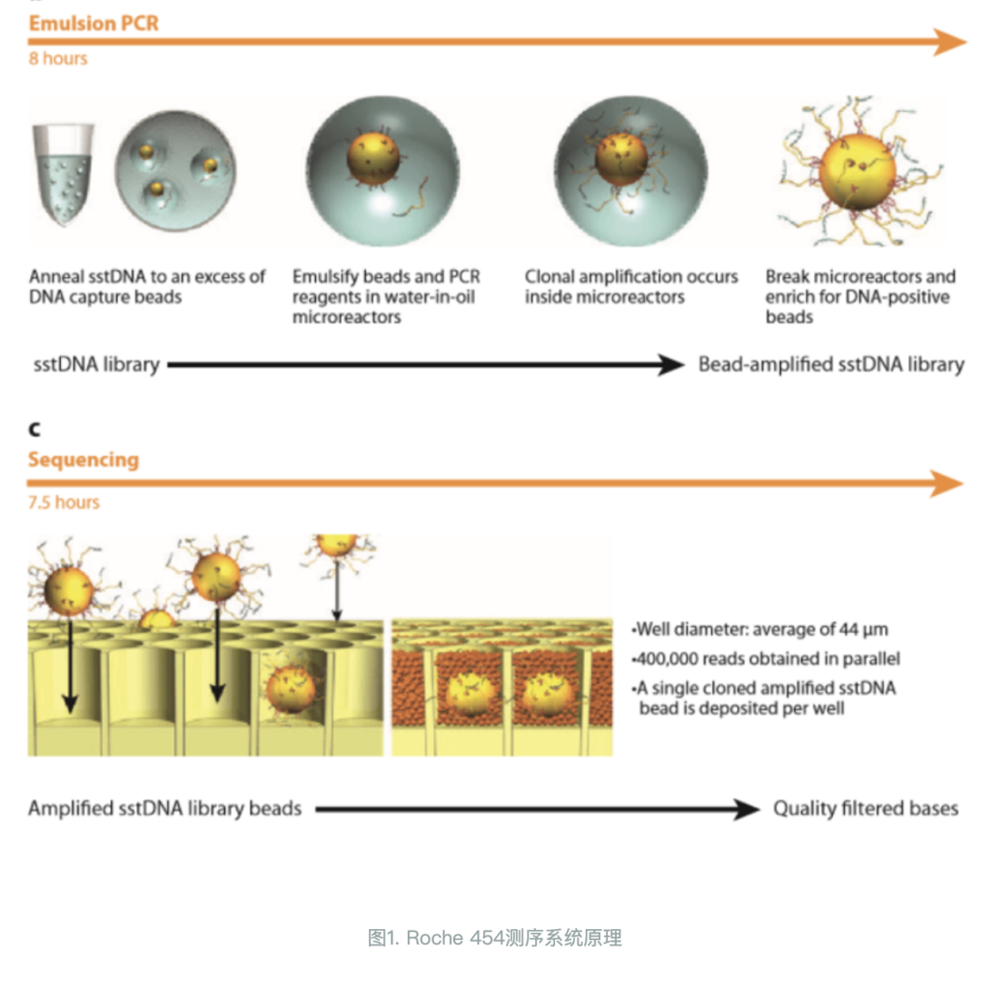本篇内容,我们将进入到第二代测序也就是高通量测序的内容分享。包括: 随着历时13年耗资近3亿美元的人类基因组计划的完成,生命科学划时代地进入功能基因组时代。人们开始期待在基因图谱中找到疾病发生的确切机制,并实施精准的医疗计划。第一代测序技术虽然具有长读长和准确率高等优势,但其测序成本高、耗时久、通量低等缺陷使其不能满足大规模测序的需求。1996年Ronaghi 和Uhlen建立了焦磷酸测序。2005年454 Life Sciences公司推出了基于焦磷酸测序原理的Genome Sequencer 20系统。这在测序史上是具有里程碑意义的大事件,其改变了测序的规模化进程,成为第二代高通量测序的先行者。第二代测序技术的核心思想是边合成边测序,其最显著的特点就是高通量和自动化。不同于Sanger测序技术对模板进行克隆后进行单独反应,第二代测序技术将模板DNA打断成小片段并通过桥式PCR(或乳液PCR)对文库进行扩增,同时对几十万到几百万DNA模板进行测序。第二代测序技术的出现使得对一个物种的基因组和转录组进行深度测序变得不再遥远,其能够在保持高度准确性的同时,降低测序的成本,提高测序的速度。以人类基因组为3Gb计算,使用第一代测序技术,大概需要测序62500次才能完成人类基因组测序,每个反应按2小时计算,假设每天测序10次,每周工作7天,整个过程大约需要17年,而使用高通量测序技术仅需1周即可完成人类基因组测序。焦磷酸测序是一种由DNA聚合酶(Polymersae)、ATP硫酸化酶(ATP Sulfurylase)、荧光素酶(Luciferase)和三磷酸腺苷双磷酸酶(Apyrase)催化的新型酶级联化学发光测序技术。通过对DNA合成反应中释放的生物光信号完成实时检测,开创了边合成边测序的先河。反应底物为5’-磷酰硫酸(APS)、荧光素。在每一轮测序反应中,反应体系中只加入一种脱氧核苷酸三磷酸(dNTP)。如果它刚好能和DNA模板的下一个碱基配对,则会在DNA聚合酶的作用下,添加到测序引物的3’末端,同时释放出一个分子的焦磷酸(PPi)。在ATP硫酸化酶的催化作用下,生成的PPi可以和APS结合形成ATP,在荧光素酶的催化下,生成的ATP又可以和荧光素结合形成氧化荧光素,同时产生可见光。通过微弱光检测装置及处理软件可获得一个特异的检测峰,峰值的高低则和相匹配的碱基数成正比。如果加入的dNTP不能和DNA模板的下一个碱基配对,则上述反应不会发生,也就没有检测峰。 ATP和未掺入的dNTP由三磷酸腺苷双磷酸酶降解,开始新一个循环。2005年 454 Life Sciences公司基于将焦磷酸测序技术与乳液pcr及光纤芯片技术相结合,推出了Genome Sequencer 20高通量测序系统,发展大规模平行焦磷酸测序技术,实现了测序过程的高通量。 乳液PCR即油相包裹水相,利用油包水结构作为PCR反应的微反应器,进行PCR扩增,乳液PCR最大的特点是可以形成数目庞大的独立反应空间以进行PCR扩增。1、在PCR反应前,将含模板、dNTP、引物和DNA聚合酶的水溶液注入到高速旋转的矿物油表面,水溶液瞬间形成无数个被矿物油包裹的小水滴。2、这些“油包水”包被的磁珠表面含有与接头互补的DNA序列,单链DNA序列能够特异地结合在磁珠上。3、 在磁珠内含有PCR反应所需试剂,保证每个与磁珠结合的小片段都能独立进行PCR扩增,并且扩增产物仍可以结合到磁珠上。携带扩增DNA片段的磁珠被放入PTP板中进行测序。PTP板是一个60mm✖️60mm的光纤板,包含约160万个微反应器小室,每个小室(直径29μm)只能容纳一个磁珠(直径28μm),每个小室中都载有焦磷酸测序所需的各种酶和底物。随后4种dNTP依据T、A、C、G的顺序依次进入PTP板,开始测序反应,流程同焦磷酸测序一样。2007年 454 Life Sciences公司被Roche公司收购后又推出性能更优的第二代测序系统——Genome Sequencer FLX System。该系统读长超过400bp,10小时运行可获得100万条序列,4~6亿个碱基信息,且准确率达99%以上。 454 高通量测序系统在读长上具有明显的优势,使得后续的拼接工作更加高效和准确。是基因组从头测序、转录组分析、基因组结构分析等应用最理想的选择。但是由于使用的是焦磷酸测序原理,对瞬时发光进行检测,因此限制了其更大的通量,并且对于同聚物(连续数个碱基相同的序列)的检测不够准确,同聚物越长,可能产生的误差越大。除此之外,和其他高通量测序平台相比,共测序成本要高很多,在激烈的市场竞争中,并没有发挥出其先行优势。2013年Roche 公司宣布正式关闭 454测序业务。2007年Rothberg离开LifeSciences公司后立即创立了Ion Torrent公司,并开发出基于半导体芯片的新一代革命性高通量测序平台。Ion Torrent测序系统是第一个没有光学感应的高通量测序平台.IonTorrent测序是以半导体芯片为载体,通过检测DNA链在合成时释放H+从而引发的pH变化,把化学信号转变成电信号从而获取碱基信息的边合成边测序技术。1、 Ion Torrent测序系统同样运用了乳液pcr技术。测序反应发生在Ion Torrent芯片(一种布满小孔的高密度半导体芯片)上.每个小孔只能容纳一个测序珠子,孔底端有pH敏感型晶体管传感器,可检测孔内pH变化并将化学信号转变为数字信息。2、将准备好的测序珠子混悬液从芯片进口注入,对芯片离心以便更好地将单个测序珠子卡在单个小孔中。芯片上小孔数量越多,测序通量越大。3、 将分别含有A、T、C、G四种dNTP溶液分别依次流过芯片,若加入的dNTP与DNA链上碱基成功配对,此时会释放一个H+离子,导至小孔内p
