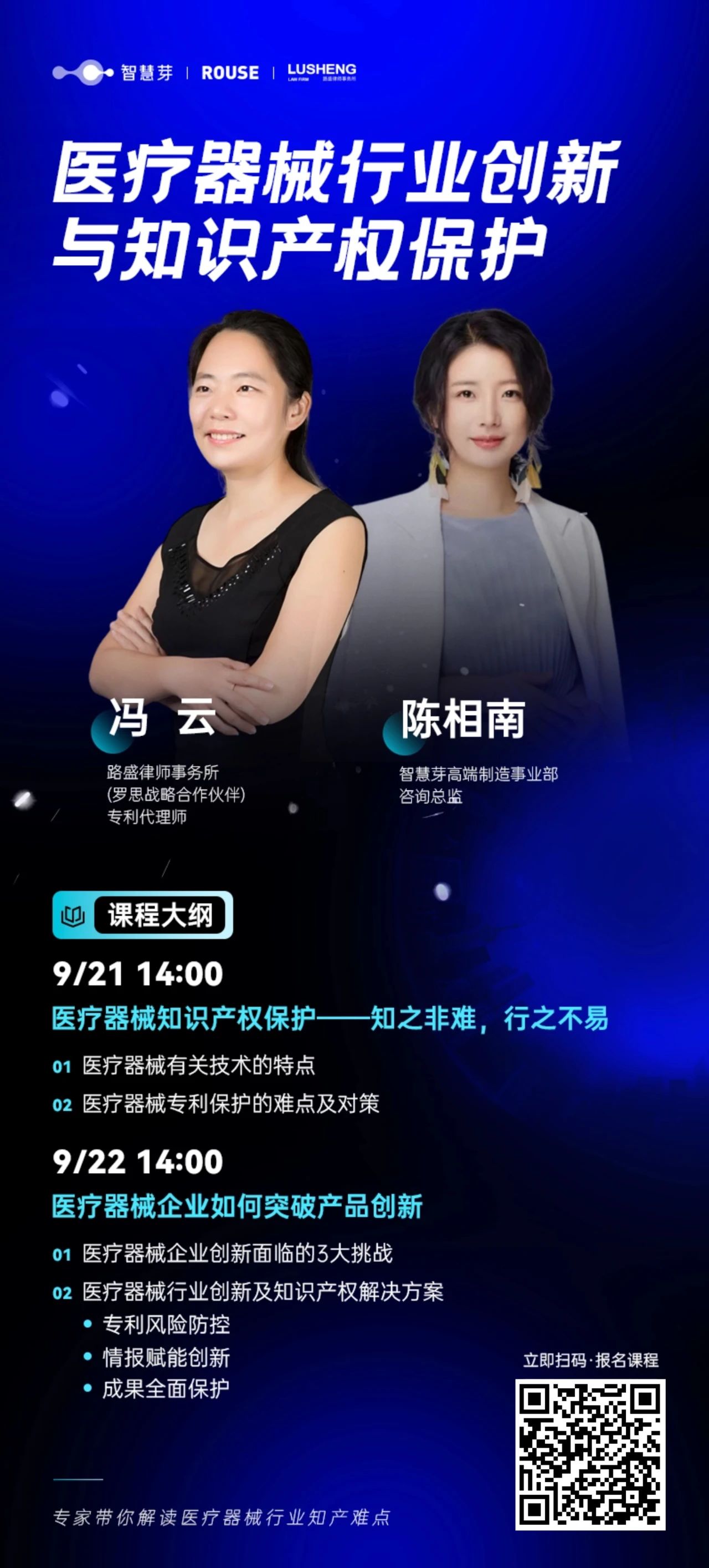 中国医疗器械市场近年表现突出,中国已经成为仅次于美国的全球第二大医疗器械市场。与此同时也遭到了遇外国竞争对手的专利围剿,2023年起,有10+家中国医疗器械企业遭遇337调查。商业摩擦也频发,2023年2月,爱尔康与强生达成专利纠纷和解,同意支付1.99亿美元,2023年6月,波士顿科学在同库克医疗的专利纠纷中赢得1.58亿美元。但由于医疗器械尤其是高端医疗器械具有高研发投入、长研发周期、多学科交叉等特点,因此,知识产权的保护也更为复杂。•技术简单,上市容易被反向工程破解 •需要及时申请专利 •选用适当的专利权保护类型 •高价值专利的要满足的要求 •专利侵权纠纷双方的攻守之道 •其他国家和地区特殊可利用的专利制度 9月21日-22日 14:00,智慧芽联合罗思咨询、路盛律师事务所邀请路盛律师事务所(罗思战略合作伙伴)专利代理师 冯云老师和智慧芽高端制造事业部咨询总监 陈相南老师做客智慧芽直播间,和大家一起探讨医疗器械行业创新与知识产权保护。冯云老师将以《医疗器械知识产权保护——知之非难,行之不易》为主题,和大家分享医疗器械有关技术的特点及专利保护的难点及对策。陈相南老师将以《医疗器械企业如何突破产品创新》为主题,为大家拆解医疗器械企业创新面临的3大挑战,并与大家共同探讨医疗器械行业创新解决方案,为各位医疗器械从业者带来创新新灵感。