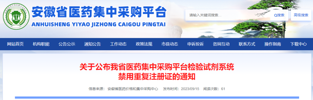 9月15日,安徽省医药集中采购平台发布了《关于公布我省医药集中采购平台检验试剂系统禁用重复注册证的通知》,将禁用一批检验试剂重复注册证。