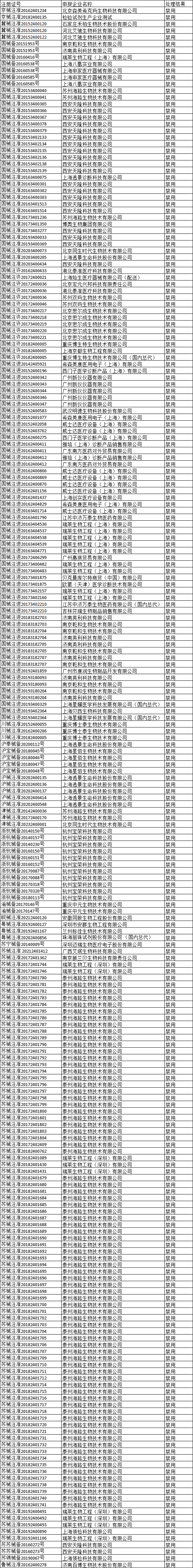 公示信息显示,共计234个检验试剂注册证被禁用,涉及雅培(上海)诊断产品销售有限公司、西门子医学诊断产品(上海)有限公司、希森美康医用电子(上海)有限公司、深圳迈瑞生物医疗电子股份有限公司、上海透景生命科技股份有限公司、西安天隆科技有限公司、武汉明德生物科技股份有限公司等。