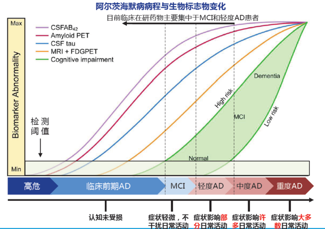 AD起病隐匿,临床主要变现为认知障碍、精神行为异常、社会生活功能减退,是一种病情进行性发展的神经退行性疾病。根据患者病情,AD通常分为临床前期、轻度认知障碍(mild cognitive impairment,MCI)、轻度、中度、重度AD,临床确诊时患者通常处于后3个阶段。在临床前期和MCI阶段,虽然患者症状不明显,但生物标志物指标已有异常。 来源:《自然评论-神经病学》、申万宏源和高禾投资研究中心