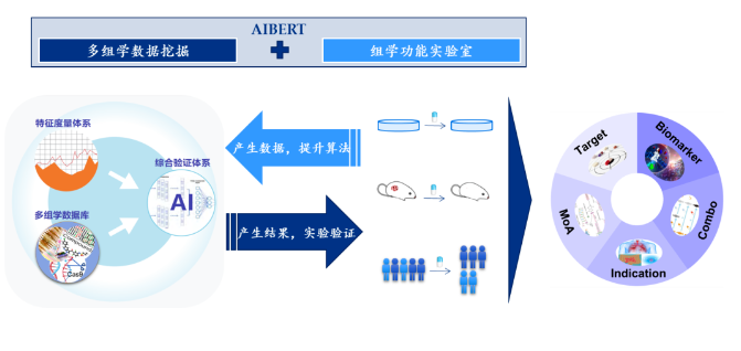 AIBERT ®系统由实验+计算两大平台组成,其中,计算平台整合了PB级别的多组学数据资源,包括数量可观且高质量的国内肿瘤患者数据,着重数据的完整性、规范性和丰富性;实验平台则拥有高通量的全基因组筛选、Crispr-cas9基因编辑、基于表型的药物筛选、基于转录组的药物筛选等技术能力,能够为计算平台提供高质量的组学数据,对计算分析结果进行验证。系统分析结果指向性较高,解决在肿瘤新药研发决策的倾向问题。