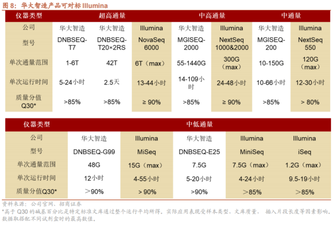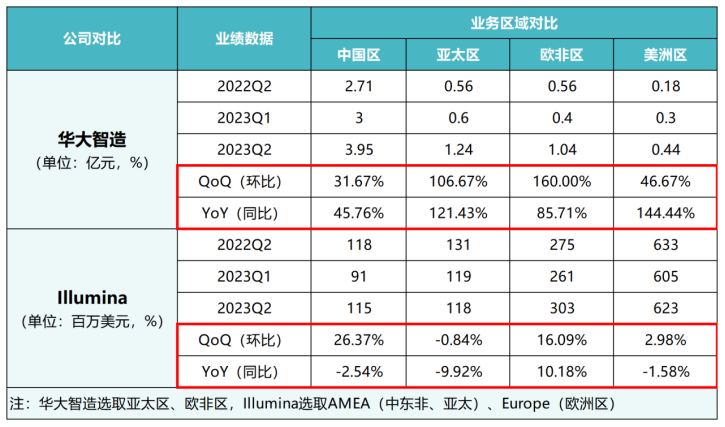高科技公司极具高成长性和未来发展潜力,因此往往享受高估值,典型的如基因测序行业的Illumina、Thermofisher等海外巨头。 基因测序行业的市场潜力和发展空间,可造就千亿美元级市场,加之高科技公司通常具有高附加值的特点,更能让优质企业享受自身α和时代β共振的双重收益。 国内标的方面,以华大智造为代表的国产智造企业,不仅能凭借技术优势和基因测序仪DNBSEQ-G99等“王炸”级产品更有优势地占领市场,同时还能复制这种高成长性和高估值。 01 基本面靓丽,成长能力优于Illumina 2023年是IVD(体外诊断)行业的变局之年,从高增速回归到疫情前的稳健增长态势,也是基因测序设备龙头华大智造重新出发的一年,正在以肉眼可见的速度迅速复兴。 2023年上半年,受市场需求变化导至实验室自动化业务和新业务销售下降影响,华大智造实现总营收14.43亿元,同比下滑38.86%;归母净利润-9802.7万元,同比下降128.52%;扣非净利润1.36亿元,同比下滑139.53%。 这些同比指标的数据只是表象,真实的业绩得看环比指标。 2023年第二季度实现总营收8.27亿元,环比一季度的6.19亿元增长33%;第二季度归母净利润实现5179万元,相较第一季度亏损1.5亿元,环比大幅增长135%;同期,扣非净利润实现2948万元,环比大幅增长118%。 华大智造单季度业绩表现 来源:东方财富网 如果一个公司的成长能力优于其所在行业的平均水平,则意味着该公司在未来预测的时间内有可能实现更快的增长,从而成为更有吸引力的投资目标。 横向对比看,2023年一季度,Illumina中国区营收下滑28%,而华大智造中国区测序仪实现营收增长26%;第二季度,Illumina总营收环比增速仅8%,不仅远不及华大智造,而且净利润亏损高达2.34亿美元,净利润环比更是惨不忍睹。 可见,华大智造2023年中报业绩相当亮眼,在短时间内便迅速补足新冠业务撤出造成的业绩真空。这主要得益于,核心产品基因测序仪市场表现大超预期,以及实验室自动化业务保持韧性。 从收入结构看,上半年基因测序仪实现收入10.98亿元,同比增长39.89%。其中,测序仪器设备实现收入4.59亿元,同比增长35.69%;测序试剂耗材实现收入6.24亿元,同比增长42.12%;服务及其他实现收入0.15亿元,同比增长96.22%。 和另外两家国际性测序设备企业的2023年中报对比来看, PacBio公司实现总营收8467万美元,ONT公司预计测序仪业务收入约8600万英镑,两家市占率排名前列的头部竞争对手测序仪业务营收均不及华大智造。 不仅如此,华大智造的基因测序业务出海成绩还相当靓丽,四大区域收入均实现全线增长:中国大陆及港澳台地区收入6.95亿元,同比增长36.42%;亚太区收入1.84亿元,同比增长10.99%;欧非区收入1.44亿元,同比增长83.55%;美洲区收入0.74亿元,同比增长141.30%。 通过横向对比可知,无论同比增长率还是环比增长率,华大智造在所有区域的增速均远高于Illumina。这意味着,如果能够保持这一趋势,全球测序市场格局将被改写。 华大智造和Illumina业务区域收入对比 来源:各公司财报 另外,实验室自动化业务板块中与公共卫生防控不相关的常规业务实现收入0.77亿元,环比2022年下半年增长25.32%,展现出回归常态后良好的业务韧性。这也意味着,华大智造的运营和发展已经进入了良性循环轨道。 这些优异的成绩,均与强劲的技术优势和海外渠道潜力被打开密切相关。 02 技术优势转化为市场优势,G99将“捅破”增长天花板 将自身的技术优势转化为市场优势,是高科技企业打破增长天花板的核心战略,也是决定投资价值的重要因素。 华大智造正是凭借自身强劲的技术优势,持续通过提升产品质量、开发新产品和推动生命数字化等措施,将技术优势转化为市场优势,进而打破增长天花板。 为了完善三大业务板块产品矩阵、持续提升核心竞争力,华大智造研发投入呈现高增长态势,2023年上半年研发费用进一步提升至4.32亿元,同比增长30.33%,占营业收入的比例高达约30%,而且研发人员数量扩充到1027人,占员工总数35.20%。 持续的投入研发,让华大智造构筑了丰富的产品线和新产品快速迭代能力,可满足用户多场景使用需求,为未来业绩爆发埋下了伏笔。 例如,在基因测序仪业务板块,针对性开发了中小型桌面式测序仪及大型和超大型测序仪,建立了全系列多型号产品矩阵;同时,在实验室自动化业务板块,提供多种实验室自动化产品,用于样本处理和文库制备等环节,可满足多样化应用场景和个性化客户需求。 经过产品持续迭代后,华大智造的品类丰富度与质量可媲美Illumina,在长度、通量、数据质量和测序效率等方面,各类型产品并不逊色于Illumina,可与国际巨头正面竞争。 例如,中小通量测序仪中的“速度王者”DNBSEQ-G99于9月6日被准许在国内市场应用于临床,支持临床方向多种DNA和RNA基因检测应用需求,实现应用领域的全解锁。此外,G99已获得欧盟、澳洲、新加坡、日本、泰国、英国、印尼医疗器械注册认证,全球市场拓展全面加速。 假设DNBSEQ-G99售价为100万元,按照Illumina 2021年1800台的销售数据,保守测算G99将为华大智造带来至少18亿元的销售额空间。而今年上半年,华大智造的基因测序仪业务收入为10.98亿元,意味着G99将成为捅破业绩增长天花板的“王炸”级产品。 另外,公司T系列产品的客户已遍布全球28个国家或地区;新一代小型化基因测序仪DNBSEQ-E25,可进一步拓展测序应用极限领域,如高海拔场地、现场检验、野外科考等常规