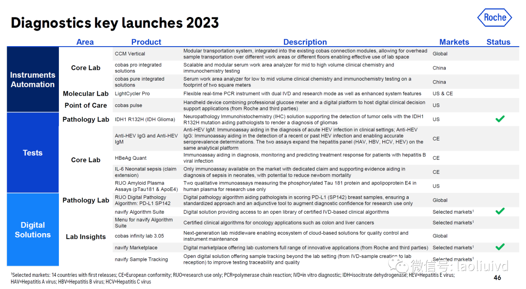 大家好,我是老刘,上篇文章写完后,一直在看外企的动态,尤其是四大家的动态,国内企业已经从传统的追随者,变成了创造者,外企的新品动态(主要在常规领域)以及对于行业趋势的研判,能给到我们国内企业一些启迪。今天把进口企业的新品给大家做一个详细的介绍,以飨读者。 一、罗氏 1、CCM Vertical 1、Elevator units 2、Overhead Conveyor units 3、Overhead Turntable units 2、Cobas pro cobas pro 虽然在2018年就已经在全球上市,相较于cobas 8000,能连接的设备更多,包括未来的质谱i601,以及c703,c503,只是在国内还没有完全launche,c503以及e801的连接已经 Approved,预计在2026年,会在国内上市自己的c703以及i601。按照官方的说法,借助 cobas pro 集成解决方案,罗氏尽一切努力将维护任务减少到最低限度。全新智能的自操作维护概念可在后台自动执行维护任务,将 cobas c 503 分析单元的日常维护人工负担降至零,将 cobas e 801 分析单元的日常维护负担降至 5 分钟,减少维护的成本以及时间,是cobas pro的初衷。 c503 下面一张图展示了罗氏在全球以及中国2023年Launches的产品及项目 规格参数: 1、检测速度:450测试/小时(一步法) 2、样本容量:140管(支持连续上样) 3、试剂位:50个 4、Tip头容量:2340个 Atellica Hema 580 CI 1900 之前在前面的文章中,写过一篇关于CI1900的介绍,详细可以移步(从西门子一体机看生免一体机的市场定位)。 这里的参数不做过多的赘述了,国内的具体落地时间,官方说法是2024年,同时也期待着这台机器的表现,毕竟还是很精致的。 贝克曼的转型,从钢针加样到Tip头的转变,传染病的项目缺失,也会掣肘贝克曼的发展,转型是必须要做的,国内的市场可不管这么多,我可以不用,但是你必须要有,巨头都懂得顺势而为,哪有这么多的逆水行舟,鲤鱼跃龙门的戏份在商战中是不存在的。 |
