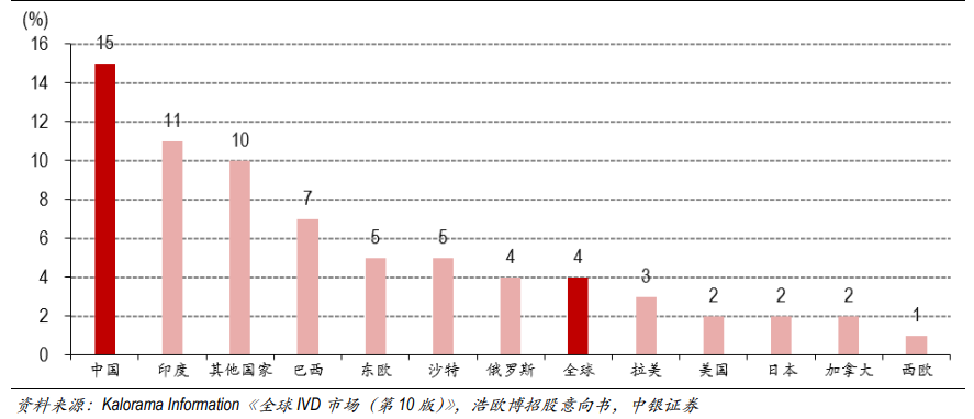 中国体外诊断市场规模从2015年约427.5亿元增长至2019年约805.7亿元,年化复合增长率达到17.2%。体外诊断市场的快速增长带来上游核心原料的需求的快速增长。体外诊断试剂核心原料外采占比依然较大,国产替代空间广阔。分子诊断酶和单抗产品是两项最大产品,也是目前国内生物原料企业必争之地。 图1. 2016~2021 年全球各地区 IVD 市场预计复合年均增长率(%)