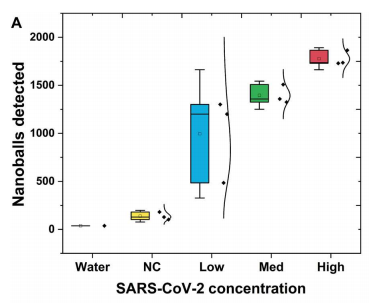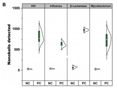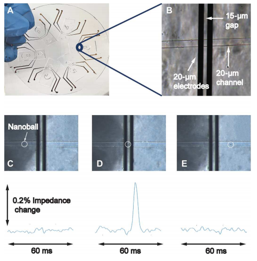 通过测量阻抗变化进行电化学检测DNA扩增是一个无标记替代荧光和比色技术。基于阻抗的生物传感器已广泛用于各种分析物,包括具有高灵敏度的蛋白质、核酸和癌细胞。此外,由于近几十年来的技术进步,电子元件经历了快速的小型化,大量减少的体积输入要求进一步提高了即时检测(POC)的可能性。 近日,一组由美国、中国、瑞典等多所顶尖大学研究团队在Science Advances杂志上发表了一篇题为“Digital assay for rapid electronic quantification of clinical pathogens using DNA nanoballs”的文章。在文章中,作者开发了一种简化的one-pot核酸等温扩增方法,可以通过电阻抗的变化来检测,而不需要微珠作为外部成核剂。作者改进了RT-LAMP反应,使扩增的DNA自核成纳米球,在微流体通道中,被动流动通过两个检测电极,在阻抗信号中产生量化尖峰。作者将其应用于SARS-CoV-2的检测,检测到的尖峰的数量与扩增DNA的数量相对应,因此病毒浓度更高。还展示了多种DNA和RNA致病序列的检测,包括来自各种病毒和细菌病原体序列,包括HIV、流感、结核分枝杆菌和β-内酰胺酶。这种技术为一种新的、简单的基于阻抗的多病原体POC核酸检测系统铺平了道路。 图片来源:Science Advances 自组装DNA纳米球 为了简化基于阻抗的DNA检测,作者开发了一种能够在一锅反应中生成DNA纳米球的分子方法,并且不需要外部成核剂。受先前滚动圈扩增(RCA)工作的启发,作者改进了LAMP反应,设计标准的六个目标特异性LAMP引物和两个额外的compaction引物,使扩增的DNA自核成纳米球,且纳米球的产生与等温DNA扩增平行(下图A)。当使用SARS-CoV-2 RNA测试此RT-LAMP反应时,可以在荧光显微镜下观察到自组装紧凑的DNA纳米球,直径从1到2 μm(下图B和C)。 DNA纳米球的自组装。图片来源:Science Advances 微流控装置中的阻抗检测 作者将简单的微流控芯片放在带有金电极的玻璃基板上(下图A和B)。微流控芯片采用毛细管作用驱动的被动流动,从而消除了复杂的微流控管和泵的需要。这种简单的被动流动使DNA纳米球通过的金电极上方的通道(下图D)并连接到电子读出系统。当纳米球通过金电极时,它会阻塞两个电极之间的电流路径和电场。这会产生阻抗的变化,从而在读出系统的输出处产生类似于图C至E所示的峰值特征。接下来,作者尝试改变compaction引物相对于LF和LB引物的浓度。结果显示使用更高比例的compaction引物 (9:1)产生更高的DNA纳米球数量(平均10分钟>100个),因此在接下来的实验中都使用了这个比例。 基于阻抗检测DNA纳米球的微流控芯片。 图片来源:Science Advances 检测限 研究团队以合成RNA为模板进行了梯度稀释实验,探索了该方法的检出限(LOD)。结果显示,即使是最低浓度的合成RNA测试(10拷贝RNA)也很容易与阴性对照区分开(下图A)。作者还在不同的时间间隔(5分钟、3分钟、60秒和30秒),测试了缩短电检测时间对LOD的影响。结果显示,即使在30秒,检测到的纳米球数量分布与初始合成RNA的浓度密切相关,并且在阴性对照组之间表现出统计学上的显著差异(下图B)。 检测限的分析。图片来源:Science Advances 三重复compaction引物设计导至信号增强 为了进一步提高系统的DNA检测能力,作者采用了几种策略。首先尝试增加DNA纳米球的大小或改变其电性能可能会增加信噪比,从而提高可探测性。为了增加DNA纳米球的大小,作者在compaction引物中添加一个额外的共同序列拷贝可能会增强LAMP扩增子压缩和形成纳米球的能力。结果证实了作者的推断,三重复compaction引物设计大大增加了检测到的平均DNA纳米球数量,从使用两重复compaction引物时的大约2000个增加到接近3000个(下图B)。 DNA纳米球检测实验方案的优化。 图片来源:Science Advances 临床样本中SARS-CoV-2的阻抗检测 为了测试此方法的适用性,接下来将其应用于检测来自临床诊断测试的上呼吸道拭子样本中的SARS-COV-2。随机选择了5个不同病毒载量的样本,通过RT-qPCR测量:低病毒载量(Ct 26-27),中病毒载量(Ct 22-24)和高病毒载量(Ct 17-20),并使用此纳米球方法进行检测。结果(下图A)证明了基于阻抗的检测在非提取的热灭活样品中检测临床相关病毒水平的能力,且病毒载量与检测到的DNA纳米球数量之间存在很强的关系。在Ct值(27到17)范围内检测到1000到2000个DNA纳米球。更重要的是,从SARS-COV-2阴性患者中检测到的阻抗峰值水平较低,尽管这些样本中的材料(咽拭子、鼻拭子和唾液)基质很复杂。 对COVID-19患者进行临床样本检测。 图片来源:Science Advances 利用DNA纳米球灵活检测病原体 为了证明此检测的灵活性和易用性,作者设计了针对多种病原体的LAMP三重复compaction引物,其中包括抗结核分枝杆菌、艾滋病毒、流感A/H1N1,以及一种常见的产生抗微生物药物耐药性的β-内酰胺酶基因。如下图B所示,使用所选病原体的合成遗传物质进行RT-LAMP(或LAMP)反应时成功检测到DNA纳米球。所有目标检测到的峰值均接近1000个,与阴性对照显著不同。这证明了将任何LAMP反应与基于阻抗的检测相结合的策略相适应的便利性。 对多种病原体序列进行临床样本检测。 图片来源:Science Advances 总结与讨论 研究团队提出了一种结合一锅等温生成DNA纳米球和电阻抗检测的新方法。通过使用compaction引物来改进环介导的等温扩增,扩增的靶标可以自组装成纳米球。接下来使用毛细管驱动的流动被动地让这些纳米球通过两个检测电极,在阻抗信号中产生量化尖峰。这种