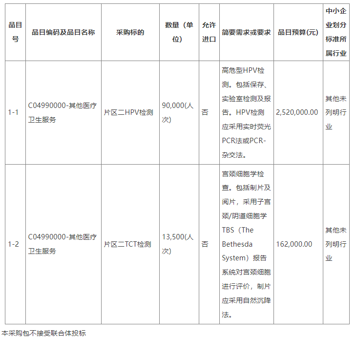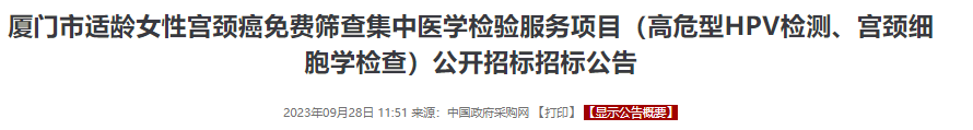 9月28日,厦门市妇幼保健院对厦门市适龄女性宫颈癌免费筛查集中医学检验服务项目(高危型HPV检测、宫颈细胞学检查)组织公开招标,本次招标的HPV检测人份数为9万人次,预算金额252万,招标需求为高危型HPV检测,包括保存、实验室检测及报告,粗略估算每人次为28元(252万/9万)