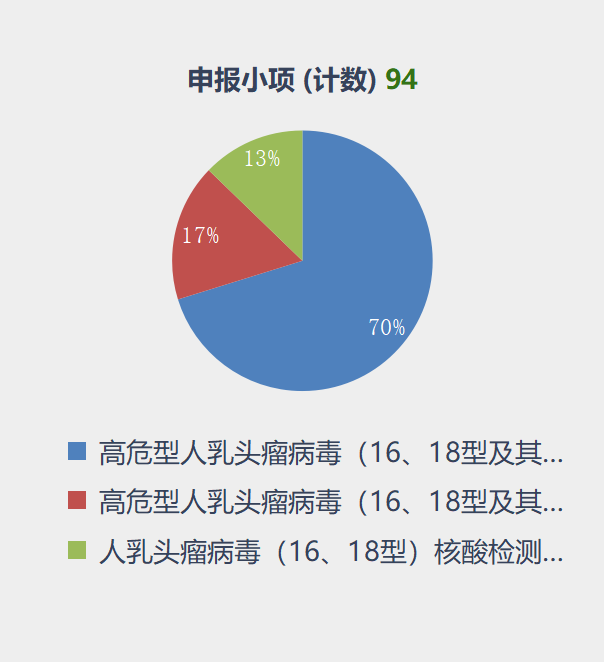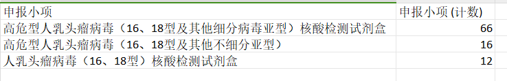 据安徽集采中心通告,本次纳入申报纳入集采的HPV试剂盒共计94款,按照分类来看,高危型人乳头瘤病毒(16、18型及其他细分病毒亚型)核酸检测试剂盒的申报量最多,达到66款。