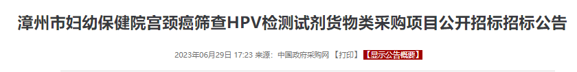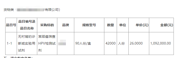 同样是今年的6月29日,福建漳州市妇幼保健院的宫颈癌筛查HPV检测试剂的公开招标中显示,HPV检测试剂的采购人份是4.2万人份,预算160万,中标价是109万,试剂的单价为26元