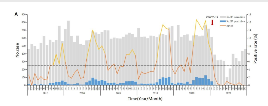 今年是支原体肺炎「大年」吗? 支原体肺炎是由肺炎支原体感染所引起疾病,通过咳嗽或打喷嚏时产生的飞沫进行传播,典型的症状是 5 岁以上的大孩子,出现发热、干咳、乏力、头痛等为主的表现,鼻塞、流涕等稍少见。 看目前全国的阵势,今年可能是个大年。出现这个情况,推测和两个因素有关: 1. 今年疫情防控放开。不仅是支原体感染,后续的呼吸道合胞病毒也需要警惕; 2. 肺炎支原体约每 3~7 年总会流行一次。 下图是北京地区 2015~2020 年,急性呼吸道感染中肺炎支原体的阳性率(黄线),2015~2019 年一直处于上升趋势,2019 年是个高峰,2020 年一下子就降低了。间隔了 3 年,今年再次流行也符合流行规律。 来源:参考文献[1] 如果要进行病原学检查的,有 3 种常见方式,大家可以了解下: 1. 进行核酸或多种病原检查 如果能查支原体核酸,且能很快出结果,那就查核酸。 一个核酸包里面,除了肺炎支原体外,还有好多种病原,价格贵一些,但是灵敏度和特异性比较高,查出来能进行比较精准的治疗,在医生看来是好的检查方式。 2. 咽拭子支原体抗原检查 抗原在疾病开始时就能查出来,不需要抽血,查咽拭子就行,阳性就考虑是感染,简单方便。 如果不能进行核酸检查,那就进行多种抗原检查,抗原可以单独检查,也可以组合检查,比如同时进行肺炎支原体、呼吸道合胞病毒、流感等检查,这时还可能要参考下血常规综合分析。 1. 病毒阳性,支原体阴性: 按照病毒处理,基本就是观察;如果这时症状特别像支原体感染的典型症状,可以按照支原体治疗; 2. 支原体阳性: ● 如果查出来是支原体抗原阳性,但没有任何症状,那就是携带,不需要治疗; ● 如果抗原阳性,同时有症状,才能考虑是支原体感染,需要治疗按照支原体治疗,先上阿奇霉素;再多说一句,如果是支原体感染引起的单纯上呼吸道感染,也能自己好。 3. 病毒、支原体均为阴性,参考血常规: ● 如果是白细胞无明显变化或略微偏低的病毒血像,就按照病毒处理; ● 如果是白细胞有升高,但不是很明显,同时症状像支原体表现,按照支原体治疗; ● 如果血常规提示白细胞、中性粒细胞,以及炎症指标如 CRP、PCT 等明显升高,有细菌感染局灶感染症状和体征,以及伴精神状态差、寒战、持续高热等情况,考虑细菌感染,那就按照细菌性肺炎治疗。