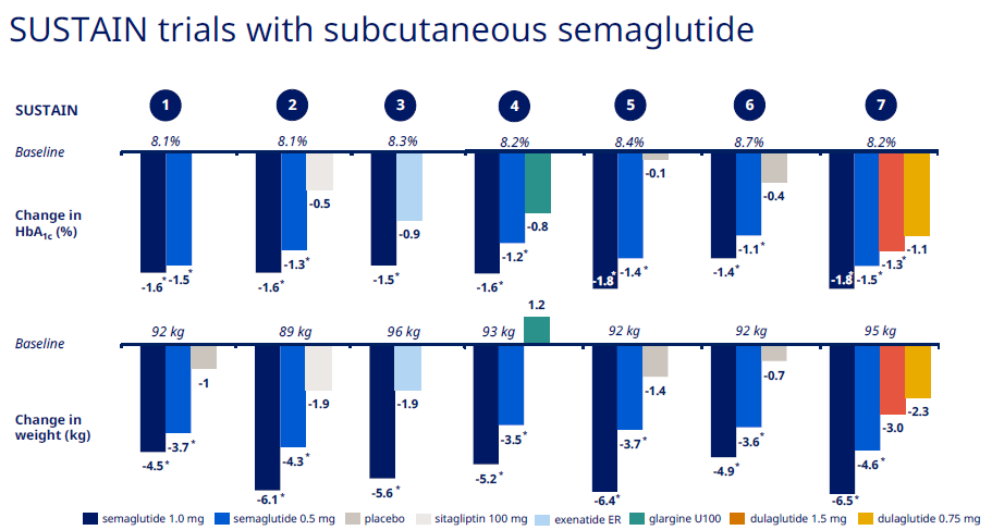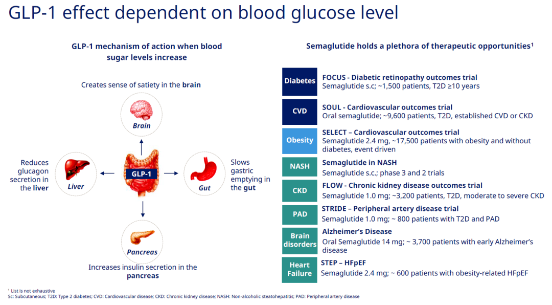 ▎Eastwood 从四五年之前开始,诺和诺德每次发布的公开材料里几乎都会有一张固定但不断更新的图,那就是GLP-1在新适应症的系统性扩展。这源于诺和诺德对于代谢疾病的深刻理解,也体现在其研发管线的推进策略上,而司美格鲁肽就是实现这一宏伟构想的核心管线。围绕肝脏、脑、肠道、胰脏,司美格鲁肽逐一将多个大适应症收入囊中。 首个GLP-1艾塞那肽2005年在美国上市,很长时间里GLP-1都局限在糖尿病适应症上。2014年,诺和诺德利拉鲁肽获批治疗肥胖症,商品名Saxenda。2017年,司美格鲁肽横空出世,并击败一众对手,顺利获批治疗糖尿病,商品名Ozempic,开启了司美格鲁肽时代。 2021年6月4日,司美格鲁肽减肥版获批上市,商品名为Wegovy,只需要每周注射一次。肥胖适应症获批,正式开启了司美格鲁肽的适应症拓展之路。 2022年8月3日,诺和诺德宣布司美格鲁肽17500例超大规模三期临床SELECT(肥胖患者降低心血管风险),在中期分析中没有达到停止标准。不过,到2023年8月8日,诺和诺德宣布SELECT最终证实司美格鲁肽可以降低20%的心血管风险。 2023年8月25日,诺和诺德公布 3 期 STEP HFpEF 试验结果。每周 2.4 mg 司美格鲁肽 可有效减轻射血分数保留的心力衰竭 (HFpEF) 肥胖成人的心力衰竭症状、增强活动能力并促进体重减轻。司美格鲁肽组患者在52周的6分钟步行距离(6MWD)平均增加21.5米,安慰剂组则平均增加1.2米,预估治疗差异为20.3米(p<0.001)。 2023年10月10日,诺和诺德宣布司美格鲁肽治疗合并肾功能不全二型糖尿病患者和慢性肾病的三期临床FLOW由于疗效优异提前终止。IDMC总结了中期数据,疗效达到了特定的预设标准,因此建议停止FLOW临床。临床结果对于诺和诺德仍然是盲态,预计2024年上半年数据读出。 同时,诺和诺德也在为司美格鲁肽寻找搭档,进一步释放临床应用潜力。如司美格鲁肽+Cagrilintide联合治疗起到了协同效应,减重效果相比司美格鲁肽单药治疗提高了2倍。该联合治疗的糖尿病适应症也进入三期临床阶段。 总结 司美格鲁肽在美国的专利保护期到2032年,欧洲和日本的保护期到2031年,仍有很长的生命周期。业界仍在期待司美格鲁肽在NASH、阿尔茨海默症、外周动脉疾病等领域的探索结果。凭借司美格鲁肽的优异表现,诺和诺德也成为坐稳4000亿美元市值的医药龙头。 |