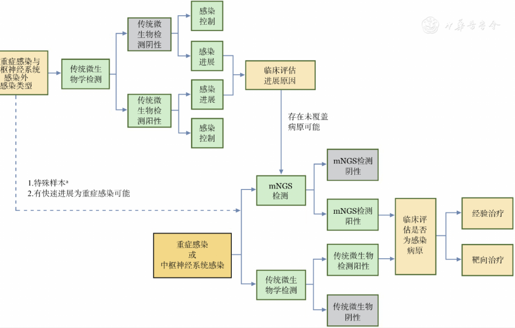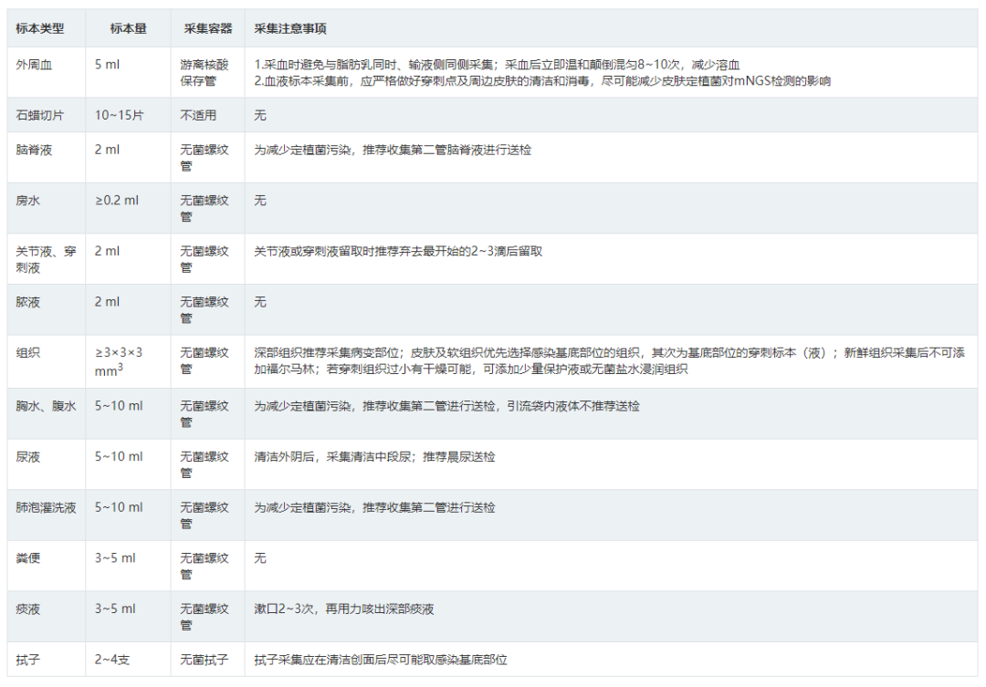 共识1:感染是血液病患者常见的并发症,当疑似感染发生时,应首先选择传统微生物学检测,仅在特殊情境下谨慎选择病原mNGS检测。 图1:血液病患者病原宏基因组二代测序(mNGS)送检流程图 1、中性粒细胞缺乏(粒缺)伴发热 共识2:低危且无明显感染灶的患者,如经验抗菌药物治疗≥7 d未明显好转可考虑在送检血培养的同时送检外周血标本mNGS;高危患者初始经验性治疗72~96 h无效时,推荐送检传统微生物学检测的同时送检血液mNGS。 2、血流感染(BSI) 共识3:疑似BSI患者,在留取血培养标本的同时留取血浆样本,于-80 ℃暂存;如72 h内血培养阴性且抗感染治疗无改善的患者,推荐将留存样本进行mNGS。疑似脓毒症的重症患者,建议送检血培养同时送检血mNGS。 3、下呼吸道感染 共识4:下呼吸道感染患者首选支气管肺泡灌洗液(BALF)送检传统微生物学检测,难以进行支气管肺泡灌洗的患者,可以选择深部痰进行检测,并同时留取标本冻存。如抗感染治疗≥72 h感染症状无好转或影像学表现持续加重的患者,建议送检留存标本行mNGS检测。如为重症下呼吸道感染或有快速进展为重症的危险因素患者,建议同时送检传统微生物学检测及mNGS。 4、中枢神经系统感染(CNSI) 共识5:疑似CNSI,推荐脑脊液在送检传统微生物学检测的同时送检mNGS,在流程上建议选择DNA检测,仅在考虑RNA病毒感染时完善RNA检测流程。 5、肠道或腹腔感染 共识6:疑似肠道感染患者推荐首选传统微生物学检测,粪便样本病原mNGS检测可作为补充。疑似腹腔感染,首选感染部位样本送检,如不能获得感染部位样本可选择血液样本送检,但检出性能有限,不作为常规推荐。 6、皮肤软组织感染 共识7:推荐对累及深部或播散性的皮肤软组织感染患者,在完善感染部位标本传统微生物学检测的同时送检mNGS,如不能获得感染灶局部样本,可选择外周血。 7、泌尿系统感染 共识8:对于复杂性泌尿系统感染、移植后泌尿系统感染在完善传统微生物学检测后不能获得病原学证据或治疗不佳的患者可尝试尿液mNGS。 共识9:对于病原mNGS检测样本,应首选从感染部位直接采集,若无法采集可考虑外周血标本送检。 推荐首选病变部位穿刺或手术采样,如不能获得该类样本,在选择邻近部位样本时应尽量减少正常菌群和定植菌的干扰。在样本采集后应尽快转运至实验室进行检测,以减少核酸降解。不同样本采集及注意事项见 表1 。多种感染类型血液中病原载量均低于感染部位样本,所以仅推荐血液作为替代样本送检。对于无明显感染灶、感染部位样本取材困难、经临床及实验室评估存在病原和(或)核酸入血的情况可进行血液mNGS。mNGS检测结果依赖于标本质量,标本采集与运输中应严格执行无菌操作与尽快转运原则。液体样本一般送检第二管以减少穿刺部位皮肤定植菌干扰。 表1:宏基因组二代测序(mNGS)感染标本送检类型及注意事项 报告解读 共识10:致病性明确且罕见定植的微生物,低序列检出也应考虑其为致病菌可能。 图2:不同微生物在血液病患者常见临床样本中检出的临床价值判断(注 /:该类感染未见报道或该病原罕见检出;±:定植或无明确致病意义;+:条件致病菌,可为感染病原同时也可存在无症状检出,建议结合临床与传统检测共同参考;++:条件致病菌,多数检出为感染病原;+++:检出应高度考虑是致病病原,传统微生物检测阴性不能除外感染。a多数凝固酶阴性葡萄球菌可为定植菌或背景菌,少数除外(如路邓葡萄球菌);b EBV引起的肺炎罕见,造血干细胞移植后EBV检出可与罕见的肺部淋巴组织增生性疾病有关) 共识11:无菌采集获得的样本检出病原,应结合临床考虑致病微生物的可能,但需注意排除定植。 对于外周血、组织、脑脊液、胸腹水及其他穿刺液等正常无菌样本,mNGS检出的细菌与真菌应结合当地感染流行病学、患者感染部位及定植情况考虑其是否为致病病原。样本中单一高序列细菌或真菌检出往往代表其是致病微生物可能性较高,而对于多种微生物检出,其解读应结合检出病原的常见定植部位及可能的微生物或其核酸的入血途径进行判断。例如,肠道或腹腔感染时,肠道黏膜屏障的破坏可引起多种肠道微生物(或其核酸)入血,血液mNGS可出现多种微生物检出的可能,一方面不能除外发生混合病原BSI,另一方面也可能仅为核酸入血。 共识12:外周血样本mNGS报告中DNA类病毒检出常见,并非均为感染病原。 共识13:非无菌样本的结果应结合临床、标本类型、传统微生物学检测结果共同判断。 共识14:耐药基因的检出,应在充分考虑基因型与耐药表型对应性的基础上进行判断。 不同细菌耐药基因与表型的一致性差异较大,部分耐药基因可存在携带而不表达的情况,如铜绿假单胞菌、阴沟肠杆菌染色体携带AmpC基因但其未必表达,AmpC基因检出不等同于耐药;而部分基因一旦检出则应高度考虑耐药的存在,如常见的碳青霉烯类耐药基因。常见耐药基因与表型一致性较高,且属于重点关注的耐药菌及其耐药基因包括:肠杆菌目细菌NDM、KPC基因-碳青霉烯类耐药,blaCTX-M基因-广谱头孢菌素耐药;金黄色葡萄球菌mecA基因-常见β内酰胺类耐药;鲍曼不动杆菌blaOXA-23基因-碳青霉烯耐药;屎肠球菌vanA或vanB基因-万古霉素耐药。 对于非无菌部位样本,如痰液、BALF等,多种微生物检出常见,其耐药基因的检出应考虑与病原的对应情况,例如mecA基因的检出可能出自金黄色葡萄球菌,但也可
