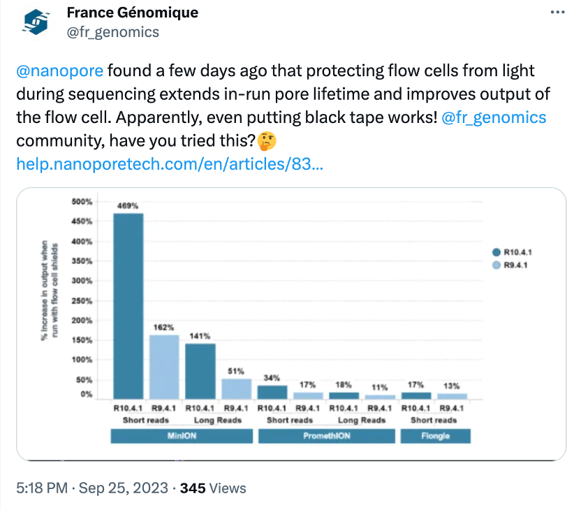 虽然已经不热了,但发现国内没有其他媒体报道,还是来分享一下。 起因是ONT 在其社群网站上发布了有关新测序模式的更新,适用于其所有流通池系列。这种新模式下孔利用率提升,从而提高了测序运行的通量和数据产量。 这权且称之为“暗黑模式”。做法都很简单,把流通池测序区域遮上避光,一旦加载样品开始测序,用户可以盖上盖子或者用其他方式覆盖这个区域。 这不是什么新奇的技术更新,只是通过遮避光来避免纳米孔测序体系在测序运行中受到影响。(所以,如题,不是标题党。) ONT提示,特别是应用的 MinION 流通池上的较短读取时,产量提**469%,而对于其他不同的测序组合也都有10%到150%的提升。 ONT在其官方社群内提供了全面的说明,非ONT用户可能看不到。社群也是ONT引以为豪的地方,不管是ONT还是其用户经常会在这里分享一些技术更新、操作改进或其他创新的尝试。 这个对话,hhh... “暗黑”模式一发布,大家就迫不及待地上手测试和验证。很多客户使用了自创的“暗黑”手段,来评估这对通量和孔寿命的影响。 如果“暗黑”真的能提升数据产量、延长孔的使用,客户一定是拍手叫好的。 “暗黑”在客户手里也出现了“奇迹”……当然,也有更多的“创新”。 光子撞击孔所在的膜,会影响孔本身的寿命和可用性。 于是就有人在问,如果减少光子的影响可以提高测序运行的质量,那么下一步是什么?是不是应该考虑地球上的不同辐射源对于纳米孔测序的影响? 除了筛选新的更快速兼顾更准确的马达蛋白之外,ONT在LC23上已经提到了缓冲液成分的迭代改进可以减少孔的阻滞及DNA相互之间的作用,进而提升产量(30%以上)。 每个PromethION流通池已经能稳定产出100G以上的Q20+数据,实现690美元的30xWHG。客户手中实现的记录是196Gb(R10.4.1,今年LC23上提到),ONT内部通过在开发的快速马达蛋白声称已经实现了>350Gb的最大产出。 如果每个流通池产量达到400Gb,ONT有可能实现200美元的长读长基因组。那会是在什么时候? 看来,“暗黑”只是个开胃小菜,这还远远不够,是需要系统地去探索一下还有哪些因素可能影响测序运行的质量、产量和持续时间。 想必这些应该都已经在ONT的日程上了。 |