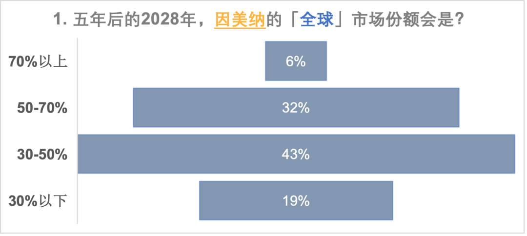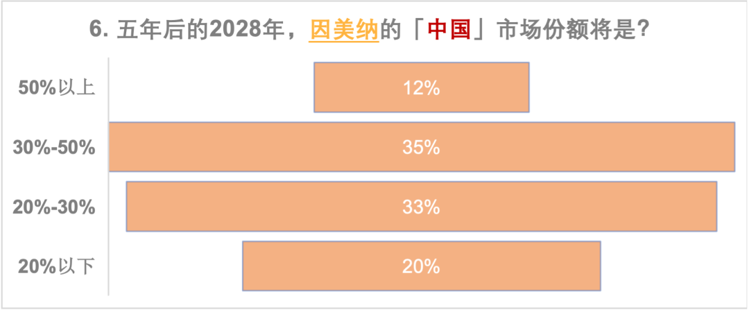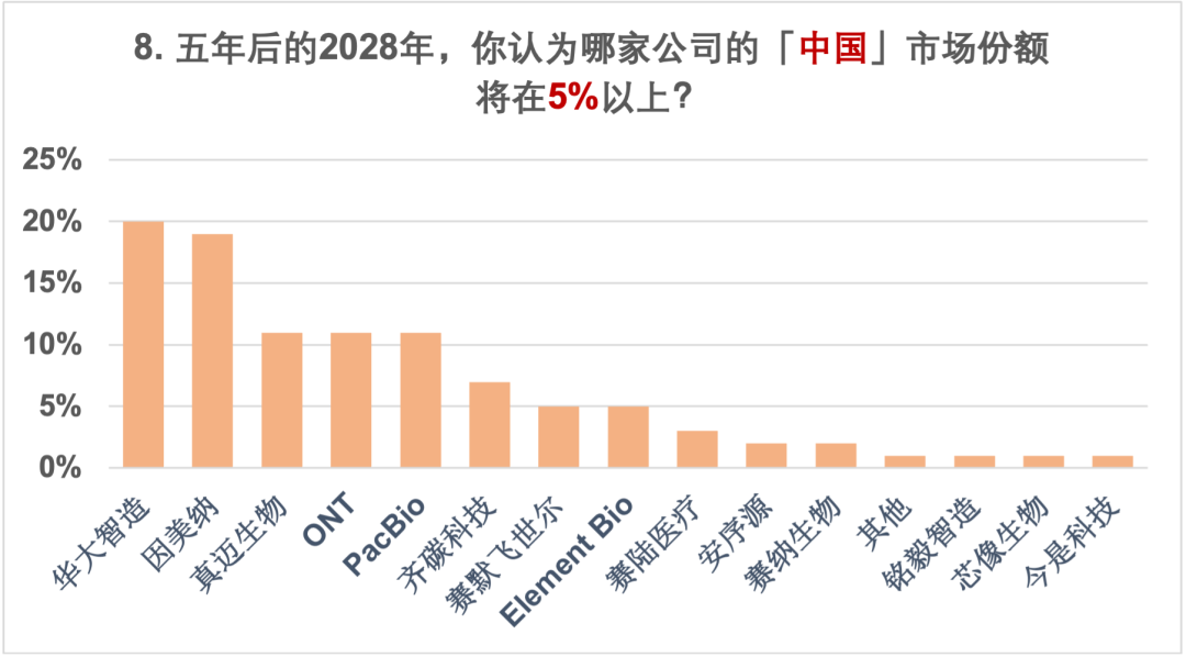 更多的人觉得因美纳的全球市场份额会掉到30%-50%,而华大智造的全球份额会来到30%; 等多的人觉得ONT的全球市场份额会上到10%-20%,而Pacbio会停留在5%-10%,大家更看好ONT; 回到中国市场,因美纳的市场份额落在了30%的水平,华大智造的份额集中在50%的水平; 在全球市场,可能能拿到5%市场份额的有力竞争者,除了传统的几大家,大家似乎都更关注Element Bio,而本土选手真迈生物和齐碳科技也具备本土竞争力。 在五年后的测序仪品牌可选数量上,分歧意见最大,最少的人选择了现有的数量,一半以上的人都认为会有更多的测序仪提供商进入市场。
