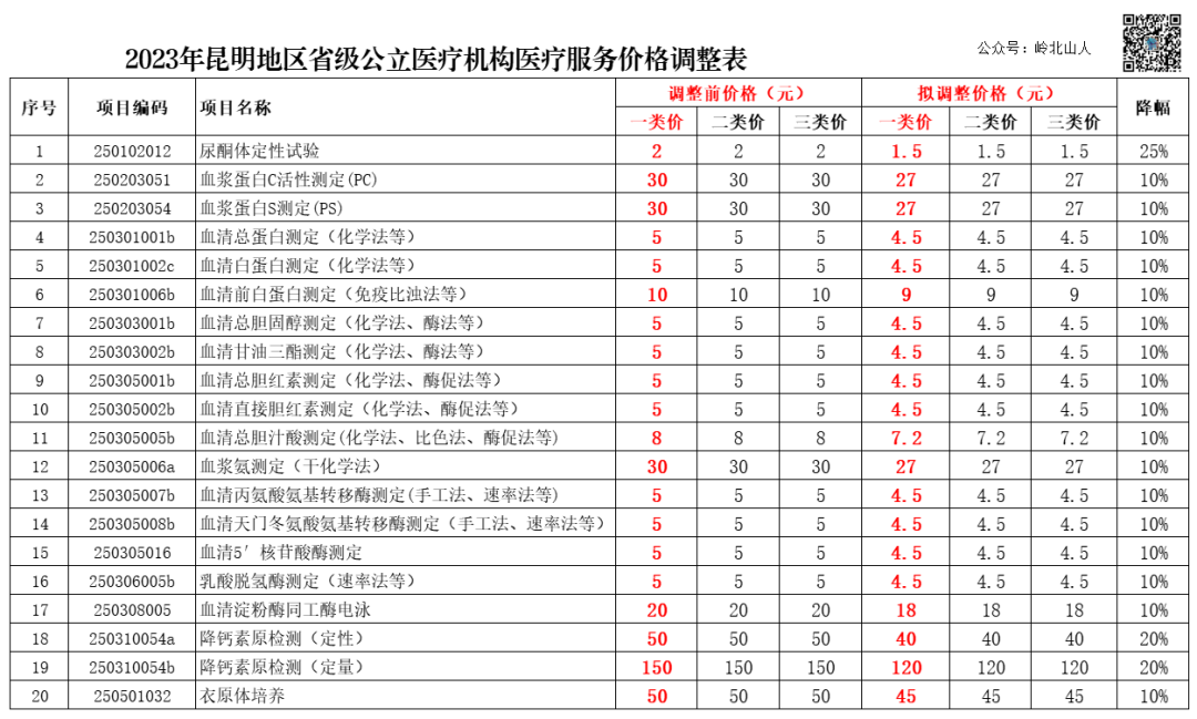 此次拟降价,虽然没有实施技耗分离收费,但从收费类别来看,不区分类型统一收费标准。而降钙素原定量检测,从150元调整为120元,降价的绝对值最高。尿酮体定性试验,从2元调整为1.5元,降幅为20%。此次,调整523项昆明地区省级公立医疗机构医疗服务价格。其中,降低20项检验类项目价格;提高503项体现技术劳务价值的手术、治疗、护理、中医等项目价格(具体项目价格见附件)。各省级公立医疗机构要建立健全内部价格管理制度,加强价格自律,规范价格行为。严格执行医疗服务价格公示制度,在服务场所显著位置通过多种方式公示医疗服务项目、价格等内容,无偿向患者提供医疗费用的查询服务。江西肝功集采项目技耗分离收费:2023年7月5日,江西医保局发布文件,关于部分肝功生化类医疗服务价格项目专项调整的公示。将肝功集采25个生化检测试剂项目的收费,全部实施技耗分离。在执行范围上,此次调整,完全打破了原收费按医院等级不同的标准,全省三二一级公立医疗机构收费按附件专项调价项目价格表统一执行,收费不再区分医院等级。非公立医疗机构和医学检测实验室等第三方检测机构提供以上检测服务,倡导参照公立医疗机构检测价格。内蒙古肝功集采项目技耗分离收费:8月21日,内蒙古医保局发布通知,关于落实肝功生化类检测试剂医用耗材集中带量采购和使用工作的通知,同时明确技耗分离收费,要求2023年9月27日起执行。为巩固耗材降价成效,在专家评审论证基础上,经国家医保局同意,对部分肝功生化类检测项目价格进行调整。本次专项调整的26项肝功生化类检测项目,实行“技耗分离”,采取“项目价格+检测试剂”方式进行收费,检测试剂作为项目“除外内容”单独收费。本次调整的项目价格实行同城同价,医保支付等级保持不变。如果把内蒙古原收费和肝功集采后技耗分离收费价格做个对比,可以看出,原收费25项三级医疗机构可以达到286元。而此次技耗分离收费后,试剂每测试最高进院价格为23元,最低价格只有8.34元。加上技术服务费,最高收费只有110元,最低只有95.84元。从286元到95元,下降了66%。 按照《国家医疗保障局办公室关于进一步做好医疗服务价格管理工作的通知》(医保办发〔2022〕16号)、云南省医疗保障局等4部门《关于印发<云南省医疗服务价格动态调整实施方案>的通知》(云医保〔2022〕138号)等文件要求,省医保局会同省卫生健康委在完成2023年度省级公立医疗机构医疗服务价格调整综合评估且符合启动条件的基础上,起草了《关于调整昆明地区省级公立医疗机构医疗服务价格的通知(征求意见稿)》,现向社会公开征求意见。任何单位或个人可以以书面形式向省医保局提出意见建议并说明理由,需签字或盖公章。可通过以下方式反馈意见:一、通过电子邮件将意见发送至:ynsybjjgzcc@163.com二、将书面意见送至:云南省昆明市官渡区环城南路439号云南省医保局价格招采处,并注明“医疗服务价格调整意见”。公开征求意见时间:2023年10月20日至11月18日,共30日。联系电话:0871—63886051、63886050(传真)