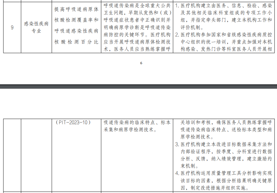 (1)感染科:提高呼吸道病原体核酸检测覆盖率和呼吸道感染性疾病核酸检测百分比! 呼吸道传染病是全球重大公共卫生问题,早期从发热和(或)呼吸道症状患者中正确识别并明确病原学诊断是呼吸道传染病防控的关键环节。医疗机构应当开展呼吸道病原体检测技术,医务人员应当熟练掌握呼吸道传染病的临床特点、标本采集和病原学检测技术。 室间质量评价是临床实验室保证和改进检验质量的重要手段,是公立医院绩效考核中的重要指标。国家卫生健康委临床检验中心及各省级临床检验中心组织的室间质量评价活动对保证检验结果的可比性和同质性,推进临床检验结果互认,提高我国临床检验质量有重要意义。(3)人体器官分配与共享计算机系统:提高人类白细胞抗原分型检测率 (PIT-2023-29) 人类白细胞抗原(HLA)分型,是用于确定个体免疫系统类型的过程,是器官移植过程的重要步骤之一。HLA 配型用于匹配器官捐献者和移植等待者的免疫系统,以降低免疫排异的风险。提高 HLA 分型检测率有助于提高器官捐献者和移植接受者之间的匹配程度,从而降低器官移植接受者排斥反应及其他并发症,有助于提高移植接受者的生活质量和术后生存时间。(4)医院感染控制专业:提高住院患者抗菌药物治疗前病原学送检率 (PIT-2023-37) 当前,全球普遍关注抗菌药物临床使用问题。提高抗菌药物治疗前病原学送检率,尤其是发生医院感染者和应用限制使用级以上抗菌药物的患者,提高抗菌药物治疗前规范送检意识和规范无菌性样本送检,可以有效提高抗菌药物使用的科学性和规范性,对遏制细菌耐药、提升治疗效果和保障人民群众健康权益具有重要意义。