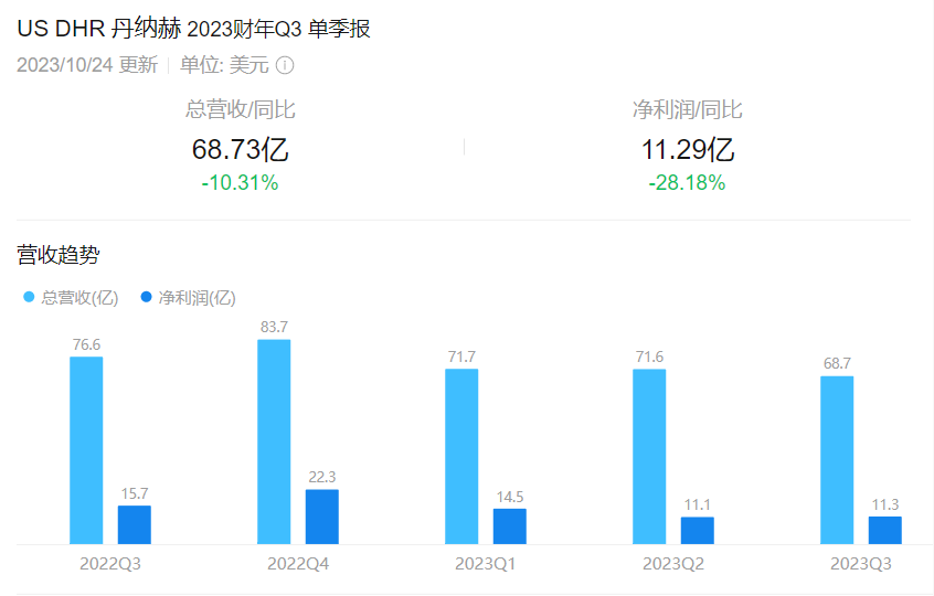 (1)罗氏诊断 -25% 在2023年的前九个月中,罗氏诊断部门的收入下降了25%,达到104.3亿瑞士法郎(约合116.4亿美元),而去年同期为138.5亿瑞士法郎,按不变汇率计算下降了18%。罗氏的前九个月总收入从2022年同期的470.4亿瑞士法郎下降了6%,达到440.5亿瑞士法郎(约合491.5亿美元)。按不变汇率计算,该期间的总收入上升了1%。其制药部门的收入从2022年前九个月的331.9亿瑞士法郎上升了1%,达到336.2亿瑞士法郎。 截至2023年第三季度,罗氏诊断报告称,其收入按不变汇率计算同比下降了5%,从39亿瑞士法郎下降到33.3亿瑞士法郎。在排除COVID-19销售的情况下,基础业务在该季度增长了7%。 在诊断部门内,罗氏的核心实验室业务在报告基础上与去年同期持平,达到58.4亿瑞士法郎,而去年同期为58.3亿瑞士法郎。其分子诊断业务的收入从27.4亿瑞士法郎下降了40%,达到16.5亿瑞士法郎,而病理实验室的收入从去年的9.75亿瑞士法郎上升了7%,达到10.5亿瑞士法郎。糖尿病护理的收入从12.2亿瑞士法郎下降了15%,达到10.4亿瑞士法郎。临床现场检测收入从30.9亿瑞士法郎下降了72%,达到8.65亿瑞士法郎。 核心实验室销售受到了免疫诊断和临床化学产品的推动,而公司分子诊断业务的下降是由于COVID-19相关销售下降了88%。这在一定程度上被宫颈癌筛查收入增长了25%和血液筛查销售增长了14%部分抵消。 病理实验室销售增长是由于高级染色和伴随诊断业务的增长,而糖尿病护理收入的下降主要是由于传统葡萄糖监测收入下降,因为更多患者转向了连续监测。罗氏的临床现场业务下降是由于免疫诊断下降了88%和分子销售下降了42%引起的。 (2)雅培诊断 -33% 近日雅培公司表示,第三季度诊断业务的收入同比按报告基础下降了33%,这是由于在其预期中的新冠测试减少而造成的。不考虑新冠测试的影响,该公司的诊断销售按报告基础上升了9%。 截至9月30日,雅培公司报告的整体收入为101.4亿美元,较一年前的104.1亿美元下降了近3%,但超过了华尔街预期的98.1亿美元。该公司表示,不包括外汇、退出中国儿科业务和收购心血管系统的影响,其有机销售同比下降了近2%。 不包括新冠测试相关销售,雅培公司表示,全球第三季度销售按有机基础上升了14%。 雅培公司第三季度诊断业务收入从去年同期的36.4亿美元下降到24.5亿美元。在诊断业务中,核心实验室第三季度销售按报告基础上升了8%,从12.2亿美元上升到13.1亿美元;分子销售下降了28%,从1.83亿美元下降到1.33亿美元;POCT销售同比上升10%,从1.27亿美元上升到1.4亿美元;快速诊断销售下降了59%,从21.1亿美元下降到8.62亿美元。不包括新冠测试销售,核心实验室销售上升了10%,分子销售下降了近4%,POCT销售上升了10%,快速诊断销售上升了13%。 (3)丹纳赫 -10.31%