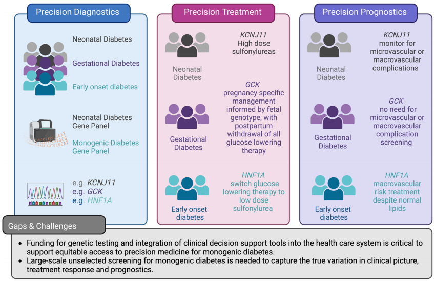 一些糖尿病类型,称为单基因糖尿病,是由单个基因的变化引起的。单基因糖尿病目前有40多种不同的遗传亚型,其中一些亚型可进行精准治疗,例如,磺脲类药物用于治疗KATP新生儿糖尿病、HNF1A 和HNF4A糖尿病。任何给定的单基因糖尿病亚型的遗传诊断都可以提供精确的预后,如EIF2AK3的肝功能障碍和骨骼发育不良或WFS1的听力和视力丧失。此外,可以为亲属提供测试,以确定他们是否有风险。诊断单基因糖尿病需要进行基因检测,但费用昂贵,因此不可能对每个糖尿病患者进行检测。 糖尿病精准医学倡议(PMDI)于2018年由美国糖尿病协会(ADA)与欧洲糖尿病研究协会(EASD)合作建立,致力于通过精准医学解决对更好的糖尿病预防和护理的日益增长的需求。近日,杂志COMMUNICATIONS MEDICINE上发表了一篇题为“The use of precision diagnostics for monogenic diabetes: a systematic review and expert opinion”的综述文章。本系统综述是代表ADA/EASD PMDI撰写,作为支持第二届国际精准糖尿病医学共识报告的综合证据评估的一部分。作者评估了已发表研究关于谁应该接受检测以及使用何种检测。在此基础上,研究团队就如何实施单基因糖尿病的基因检测为医生和卫生保健提供者提供建议。最后,作者确定了该领域的主要挑战,并强调了未来研究和投资的领域,以支持更广泛地实施单基因糖尿病的精准诊断。 图片来源:Communications medicine 主要内容 谁应该检测单基因糖尿病? 对于谁应该检测单基因糖尿病的问题,作者筛选了10,469篇出版物并纳入了100篇出版物。原综述中详细列出了纳入研究的证据摘要,感兴趣的童鞋可自行查阅。研究团队基于这些证据提供了建议如下: (1)所有6个月前诊断为糖尿病的患者都应使用基因大panel检测单基因形式的新生儿糖尿病---Grade A; 所有在6 - 12个月被诊断的患者都应使用基因大panel单基因形式的新生儿糖尿病;在12-24个月诊断为糖尿病的患者中,没有明显的单基因病因支持基因检测---Grade B. (2)妊娠期糖尿病且空腹血糖高于5.5 mmol/L且无肥胖的妇女应检查GCK病因---Grade B. (3)在没有肥胖的情况下,任何年龄持续轻度高血糖(HbA1c 38-62 mmol/mol,或空腹血糖5.5-7.8 mmol/L)的患者应进行GCK病因检测---Grade A. (4)30岁以下无肥胖症,如果自身抗体阴性和/或C肽水平保持不变,应使用大型基因panel进行单基因糖尿病检测---Grade A. 基于综合证据的建议。 图片来源:Communications medicine 如何检测单基因糖尿病? 研究团队从筛选的2102篇出版物中纳入了32项研究,共涉及76个不同基因的研究。基于对文献的系统回顾,作者提出了几点建议(如下表): (1)与基因组测序相比,靶向NGS方法是单基因糖尿病检测的首选方法,可以最大限度地提高诊断率,而无需承担重大成本和变异解读。基因组测序可以为新基因和非编码突变的发现提供数据,并允许对新相关基因和变异进行重新分析,但对许多实验室来说过于昂贵,并且需要大量的生物信息学专业知识来处理大量的变异并给出正确的分类。---Grade A. (2)靶panel的设计应包括所有已知的单基因糖尿病原因,包括线粒体糖尿病,检测已知的非编码突变(位于启动子、内含子和远端增强子),并检测CNVs。在具有高血缘关系的国家和人群中,一个包括所有隐性遗传基因的综合基因panel是必不可少的。---Grade A (3)单独的MLPA检测CNV,或基因分型分析如焦磷酸测序检测m.3243A>G是可以接受的,但成本会增加。---Grade A (4)NDM检测服务应该提供基于甲基化的分析,如MS-MLPA,因为6q24imprinting缺陷是TNDM的常见原因。---Grade A (5)GCK在疑似GCK相关高血糖中的高诊断率,以及在6-12个月内KCNJ11、ABCC8和INS在NDM中的高诊断率,以及这些诊断的临床应用,证明了在这些情况下最初对这些基因进行快速Sanger测序是合理的。---Grade A 关于如何检测单基因糖尿病的综合证据的建议。 图片来源:Communications medicine 将一个基因视为单基因糖尿病病因的依据是什么? ClinGen制定了一个评估基因疾病有效性的一般循证框架,该框架包括评估病例级别、和先前报告的变异的功能数据以及基因本身的功能数据,将基因-疾病有效性关系分为确定、强、中等、有限、有争议或驳斥的类别,并结合专家共识进行最终分配。国际MDEP GCEP的目标是管理单基因糖尿病基因的基因-疾病有效性,并正在努力扩展到这些基因之外。对于单基因糖尿病,可以在如下网站上找到一份单基因糖尿病基因列表(https://www.diabetesgenes.org/)。 作者意见是,一个基因只有在符合专家制定的用于验证基因-疾病关系的指南中规定的标准时才应被认为是单基因糖尿病的病因。这些指南已经被ClinGen MDEP GCEP应用于许多单基因糖尿病基因。建议继续通过MDEP GCEP集中研究新的以及更新现有单基因糖尿病基因的基因-疾病有效性。 在什么基础上一个变异应该被认为是单基因糖尿病的原因? 2015年,ACMG和AMP制定了序列变异解读的通用指南。这些指南经过了几次更新。ClinGen的MDEP VCEP对三种常见的单基因糖尿病基因(HNF1A、HNF4A和GCK)的通用指南进行了修改;这些指南解释了单基因糖尿病变异解读的许多问题,并且可以用作解读尚未建立规则的基因变异的框架。 ACMG/AMP指南是通过一个以证据为基础的过程制定的,结合了各种类型的证据来确定一个变异是致病的、可能致病的、不确定意义(VUS)的、可能是良性的或者是良性的。证据类型的例子包括:gnomAD等公共数据库中的频率;分离:具有疾病表型的