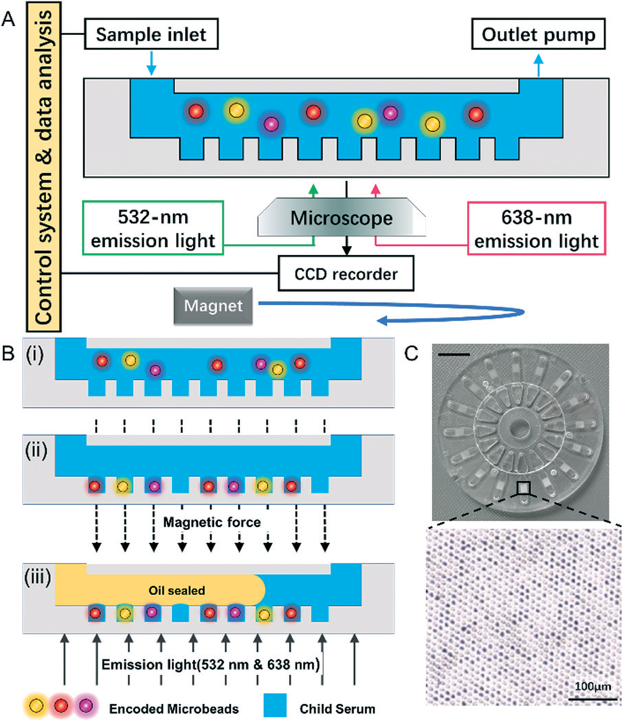 (4)将反应洗净后的磁珠与底物混合,加载到含有微孔阵列的检测芯片中,利用磁场使磁珠落入与其尺寸完全匹配的微孔中(3μm左右),加入油相,使得微孔之间物理隔离;