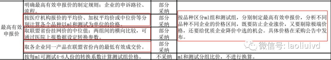 这里说的制定规则是:由专家分别制定产品的最高有效限价,根据老刘的了解,第一轮的专家价格商讨,已经在之前开过一轮,但是并没有给出明确的定义,当然没有给出明确的说明,也就意味着,目前还在博弈中,至于谁和谁博弈,大家自行猜测。如果我们不能在征求意见稿中给出猜想的话,那么我们就把时间线往前推,看看过往的集采规则。 2022年10月31号,江西省发布《肝功生化类检测试剂省际联盟集中带量采购文件(征求意见稿)》,2022年,11月29日,发布网络征求意见结果公示,从这次的结果公示中,我们可以窥出一二。关于最高有效限价的制定规则,由企业明确提出,需要说明制定规则,方便企业申诉等,当然,江西医保局一一回应了。
