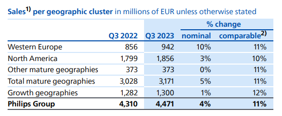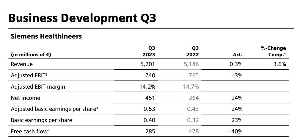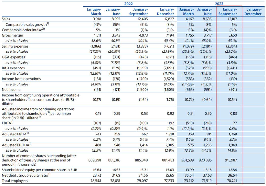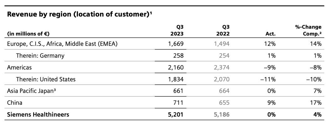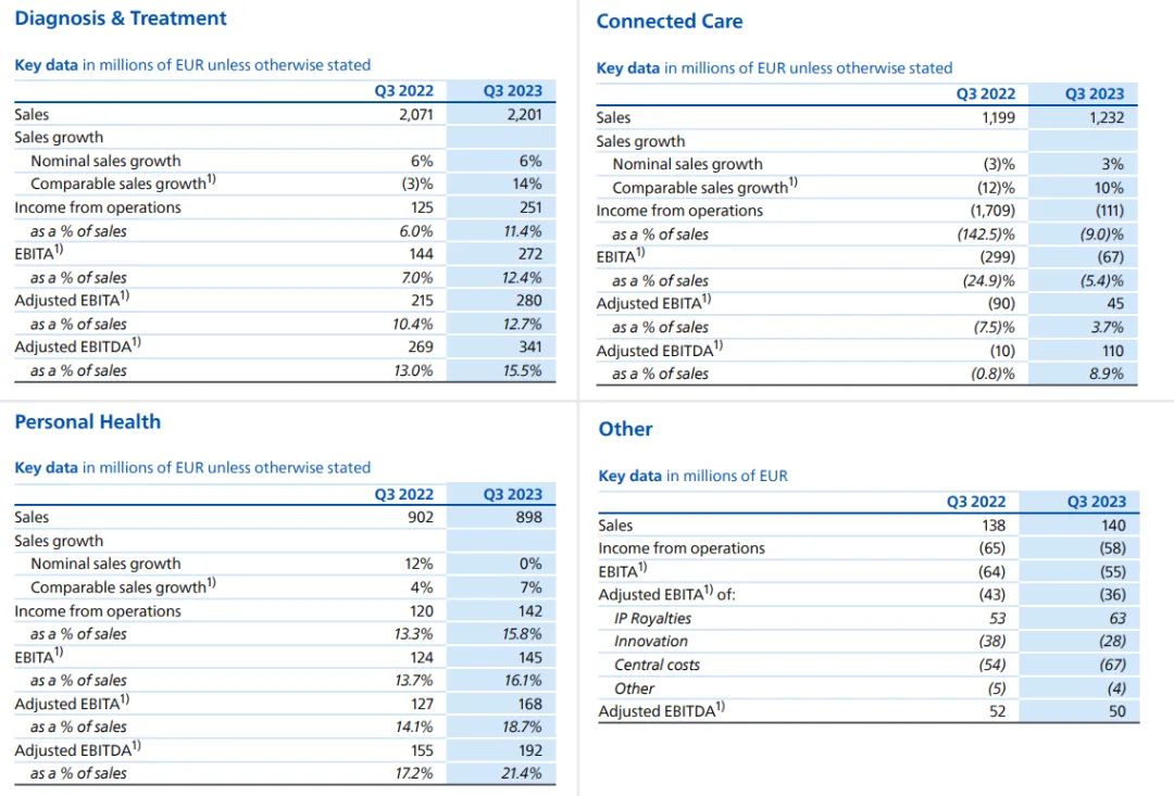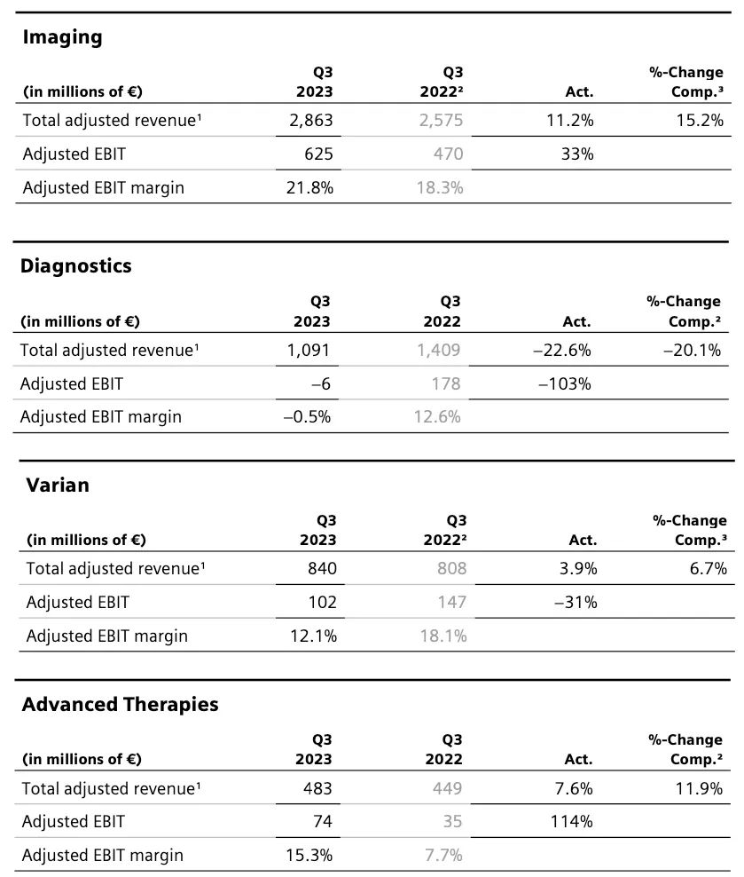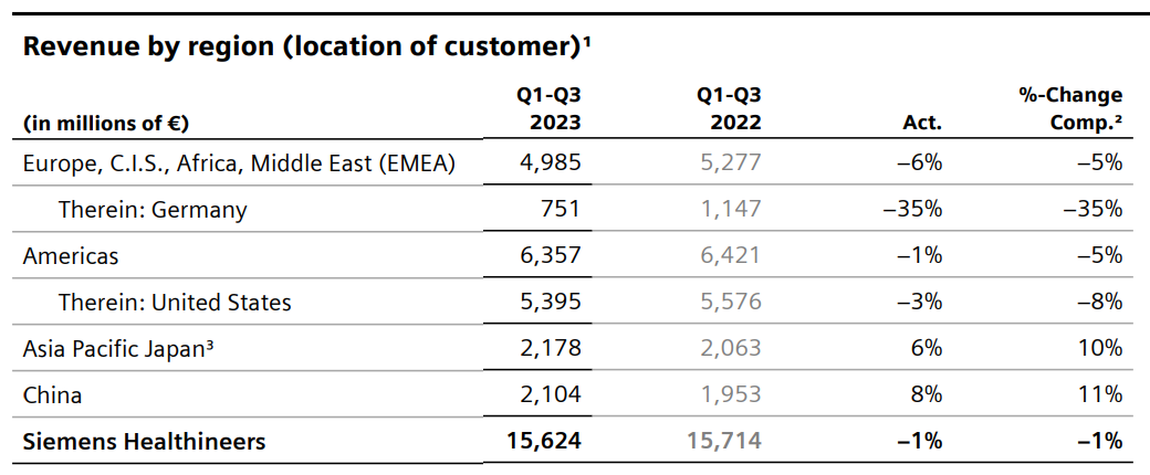 注:①按照实时汇率计算,1美元=0.9461欧元 ②飞利浦的医疗业务营收包括Diagnosis&Treatment和Connected Care&Health Informatics两个部分, Personal Health不在医疗营收统计之列西门子医疗:在IVD业务受新冠检测需求下降22.6%的情况下,依然整体增长0.3%,中国区是主要驱动力,营收增长9%。美国区下滑11%。GE医疗:整体增长5%,超声业务略有下滑,其他业务均为正增长。中国区营收7.19亿美元,占比15%,同比+8%。飞利浦:整体业务上,调整后的息税前利润较为可观,达到4.57亿欧元,超过分析师平均预期的4.13亿欧元,因此飞利浦上调了全年营收增长预测。中国区诊断和治疗业务高个位数增长。西门子医疗财年不同,2023Q3区间为2023年4月1日至2023年6月30日。2023Q3财年,西门子医疗整体营收52.01亿欧元,同比+0.3%;按固定汇率计算同比+3.6%。剔除新冠肺炎检测产品收入的损失,同比+10.1%。诊断业务受新冠检测需求影响下降22.6%,其它三大业务均保持增长。净利润:4.51亿欧元,同比+24%,主要原因是低税率的影响。利润率:14.2%,比去年同期的14.7%略有下滑。影像业务(占比54%):营收28.63亿欧元,同比+11.2%,既是西门子医疗第一大业务,也是增长率最高的业务。诊断业务(占比21%):营收10.9亿欧元,同比-22.6%。瓦里安(占比16%):营收8.40亿欧元,同比+3.9%。临床治疗业务(占比9%):营收4.83亿欧元,同比+7.6%,调整后息税前利润+114%。 欧洲区(包括欧盟、非洲、中东):营收16.69亿欧元,同比+12%。美洲区:营收21.60亿欧元,同比-9%。在总营收中占比最高(45.6%)亚太区日本地区:营收6.61亿欧元,与去年同期基本持平。中国区:营收7.11亿欧元,同比+9%,在总营收中占13.7%。2022年10月,西门子医疗宣布将原亚太区分为中国区和除中国以外的亚太区(含日本)两部分,以便充分释放各自发展潜力。前三季度,西门子医疗共收入156.24亿欧元,同比-1%;从地域来看,前三季度只在亚太日本区(包含印度)和中国区为正增长,其中中国区领涨+8%,其它区域的收入均有下滑。员工规模上,2023年6月30日为7.08万人,比2022年9月30日的6.95万人,增加约1300人。GE医疗:除超声外所有业务正增长,中国区前三季度增长最快2023年Q3,GE医疗营收48.22亿美元,同比+5%